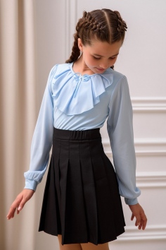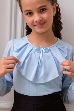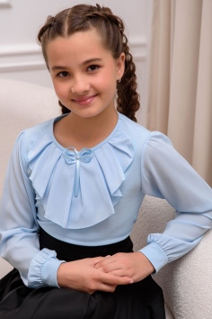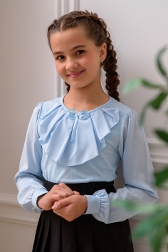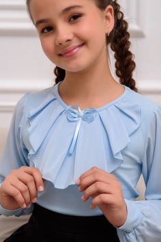 Блузка для девочек младшего школьного возраста, из однотонного трикотажного полотна - однотонная кулирка с лайкрой и шифона. Блузка полуприлегающего силуэта, с рукавом из шифона, без застежки. Спереди жабо со складками из шифона с декоративным элементом по центру. На спинке отсутствуют линии членения. Рукав длинный одношовный, присборенный по окату и низу, на манжете. Низ изделия подогнут. Срез горловины окантован.