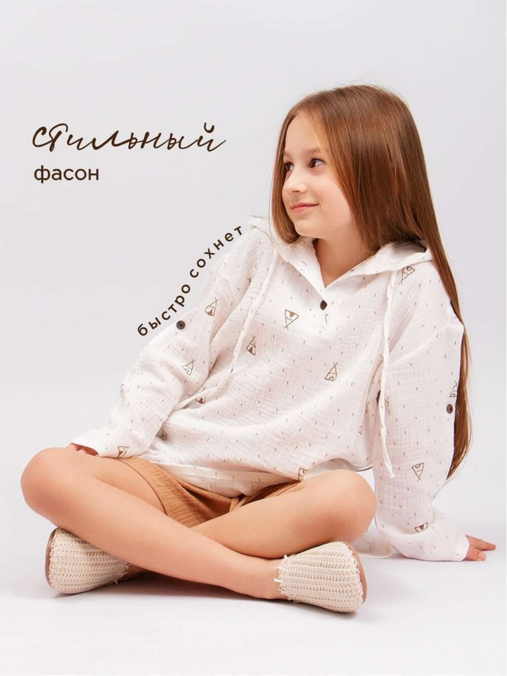 Модная, детская туника Соль&Перец свободного кроя, с капюшоном и асимметричной линией низа. На горловине и на рукавах застежки-пуговицы (кокос). Ткань-двухслойный муслин, хорошо пропускает воздух, защищает от солнца, идеально подходит для чувствительной кожи. Отличный выбор для прогулок, на пляж, в детский сад, для дома и на каждый день.