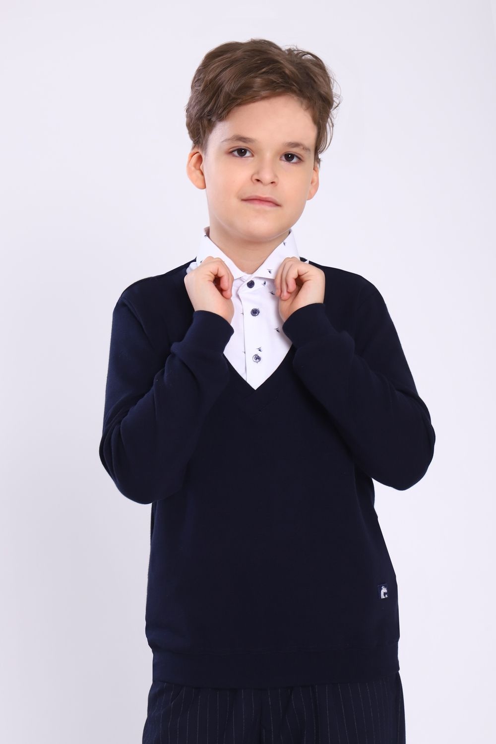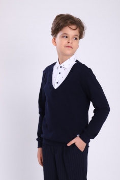 Джемпер-обманка Jersey Lab с длинным рукавом одновременно сочетает в себе 2 предмета гардероба: джемпер в классическом стиле и имитацию рубашки, с застежкой на пуговицы. Рубашку-обманку не нужно заправлять в брюки и она не выбивается из под одежды, как рубашка в классическом варианте. Изделия отшиваются из кулирки высокого качества пенье, низ рукавов и джемпера на манжете. Джемпер-рубашка - это оптимальное решение для создания стильных образов в школу и праздничных мероприятий. Джемпер для мальчика изготовлен из плотного хлопкового полотна, а воротник из рубашечной ткани.