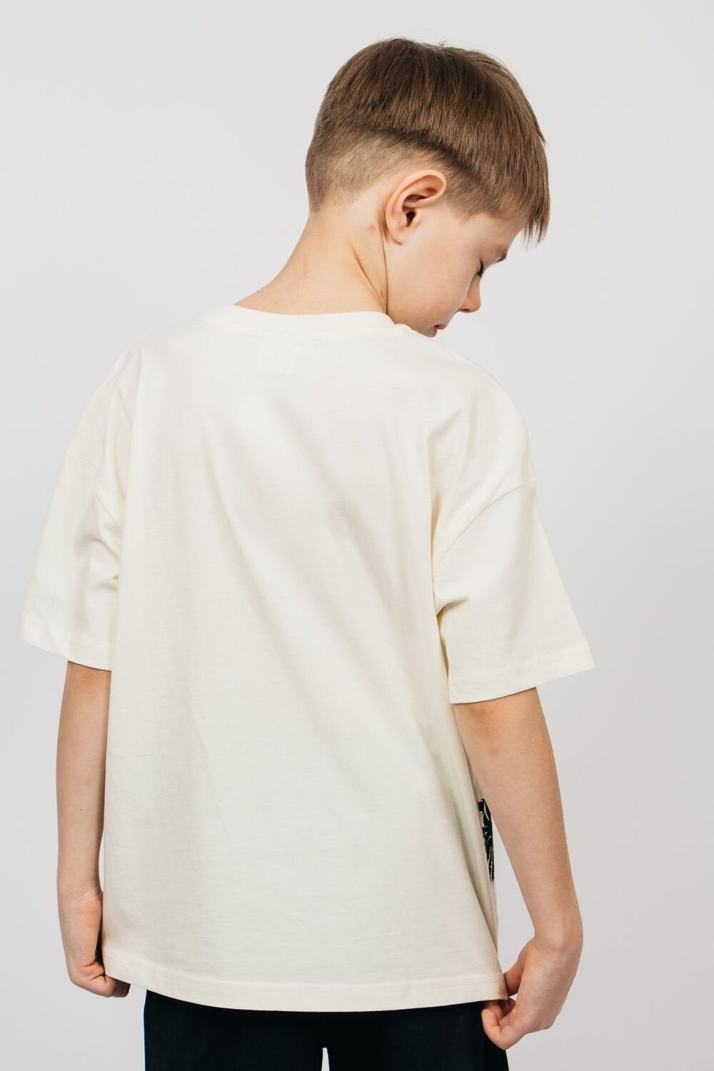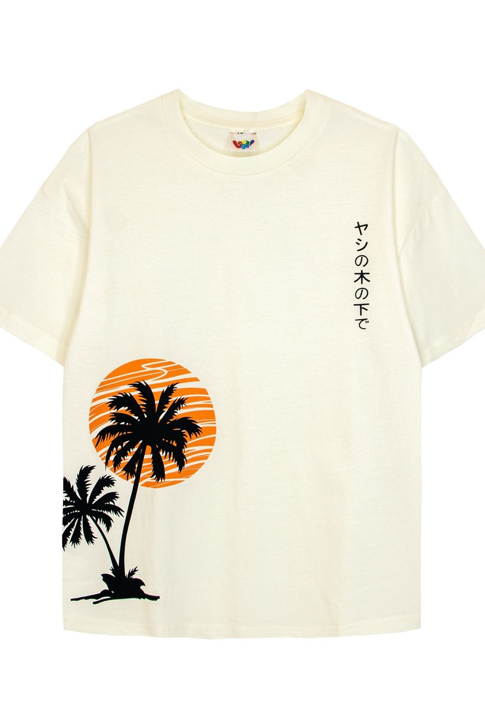 Футболка для мальчика свободного силуэта (оверсайз) с коротким рукавом. Горловина круглая, обработана воротником из рибаны. Низ изделия и рукава обработан швом вподгибку. На полочке принт шелкография. Надпись переводится как 'Под пальмой'.