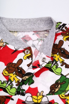 Пижама состоит из кофточки и штанов. Кофточка прямого кроя с круглым вырезом горловины на клёпке и с длинными рукавами. На рукавах эластичные манжеты. Штанишки с эластичной резинкой в поясе, низ на манжетах. Ткань приятная к телу.
