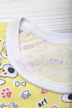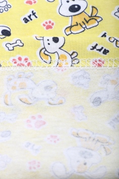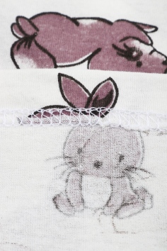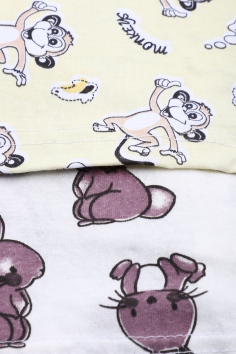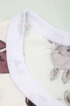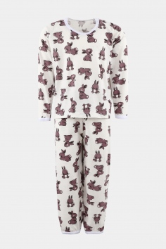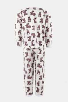 Пижама состоит из кофточки и штанов. Кофточка прямого кроя с круглым вырезом горловины и длинными рукавами. На рукавах эластичные манжеты. Штанишки с эластичной резинкой в поясе, низ на манжетах. Ткань приятная к телу.