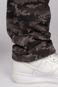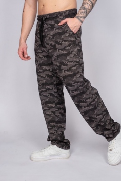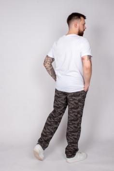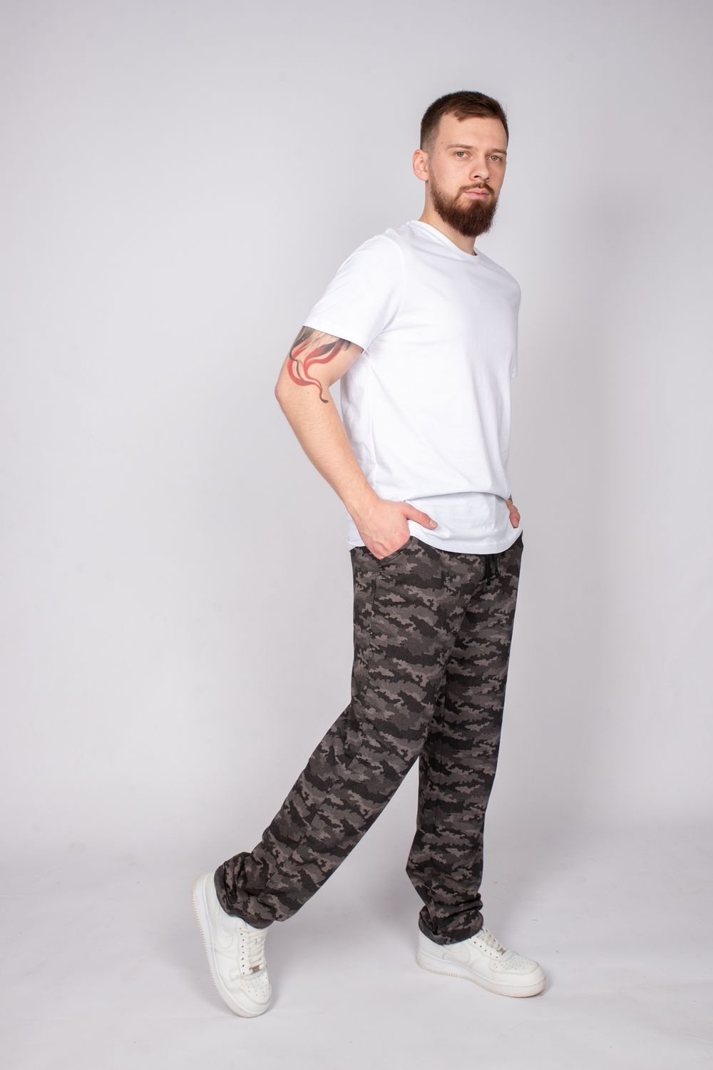Стильные прямые мужские брюки с модным в этом сезоне камуфляжным принтом подойдут любому парню, который любит собирать модные и удобные образы. Пояс отрезной, с резинкой и шнуром внутри. Брюки с карманами на передней половинке с отрезным бочком. Отвороты из основного полотна. Изготовлены из петельчатого футера с добавлением полиэстера и эластана. Подойдут на рост 182см.