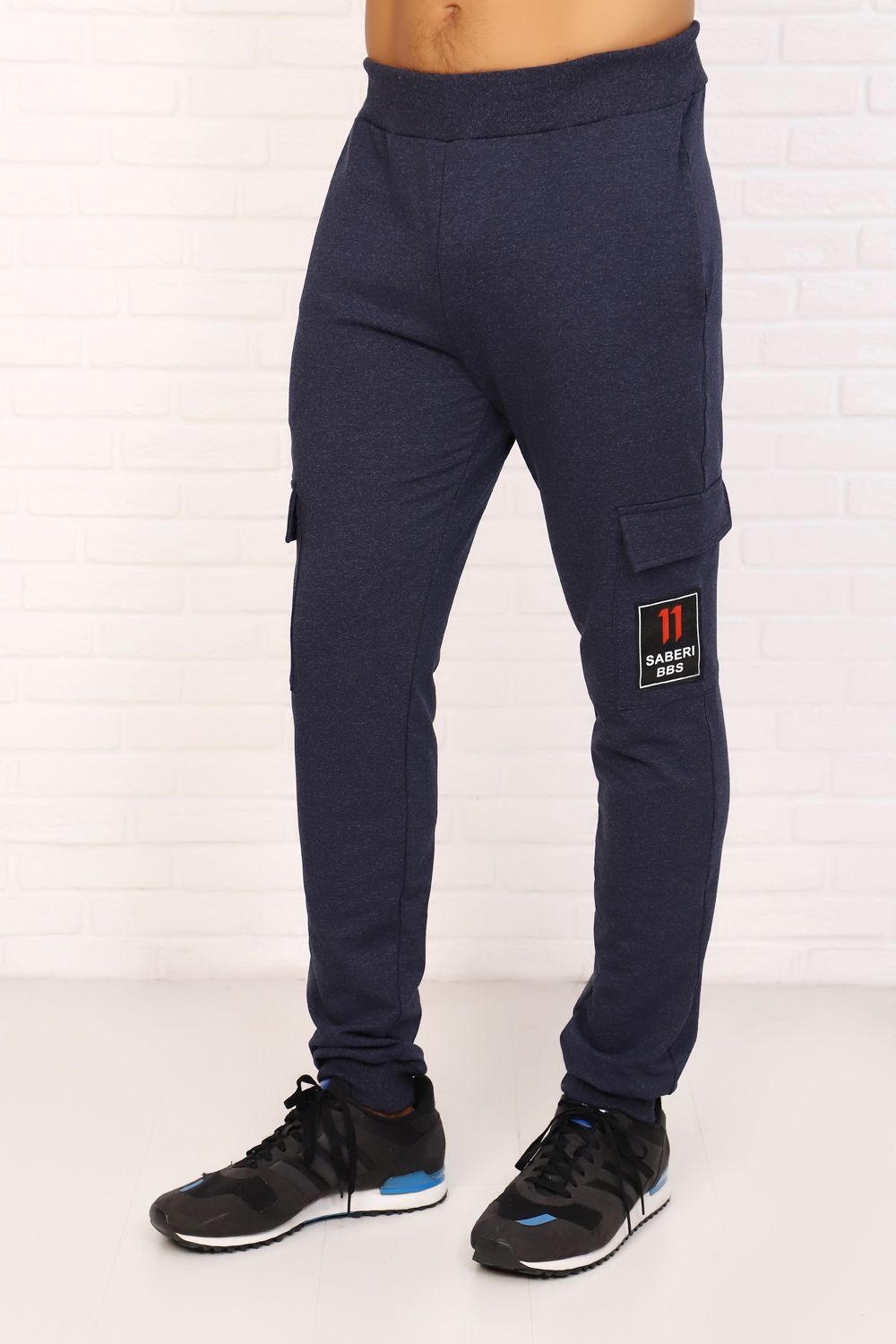 Спортивные мужские брюки на манжетах, пояс эластичный, карман в боковом шве, и накладной карман на уровне колена.