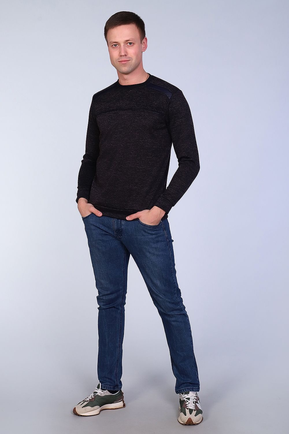 Модный и стильный мужской джемпер, длинный рукав на манжете. В плечевых швах вставки из эко-кожи. Округлый воротник, низ изделия также на манжете. Маломерит. Джемпер подходит для среднего и маленького роста. Практично и удобно.
