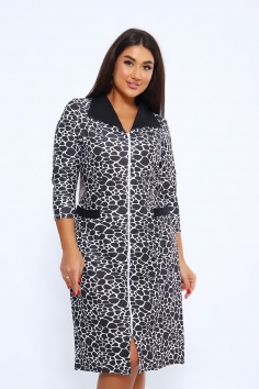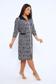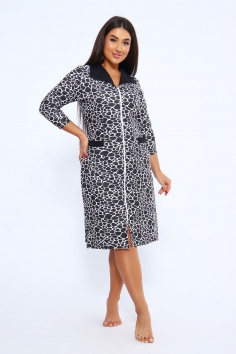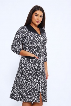 Этот халат выполнен из ткани с контрастным черно-белым принтом, напоминающим узор гальки. Длина халата до колена, рукава 3/4, что делает его удобным для повседневного использования. Впереди имеется молния, что обеспечивает легкость в надевании и снятии. Воротник черного цвета добавляет строгий акцент к общему дизайну. По бокам расположены карманы, которые не только функциональны, но и декоративно подчеркивают силуэт. Этот халат прекрасно подойдет для домашнего комфорта, сохраняя при этом стильный и современный вид.