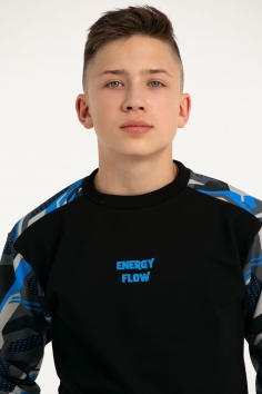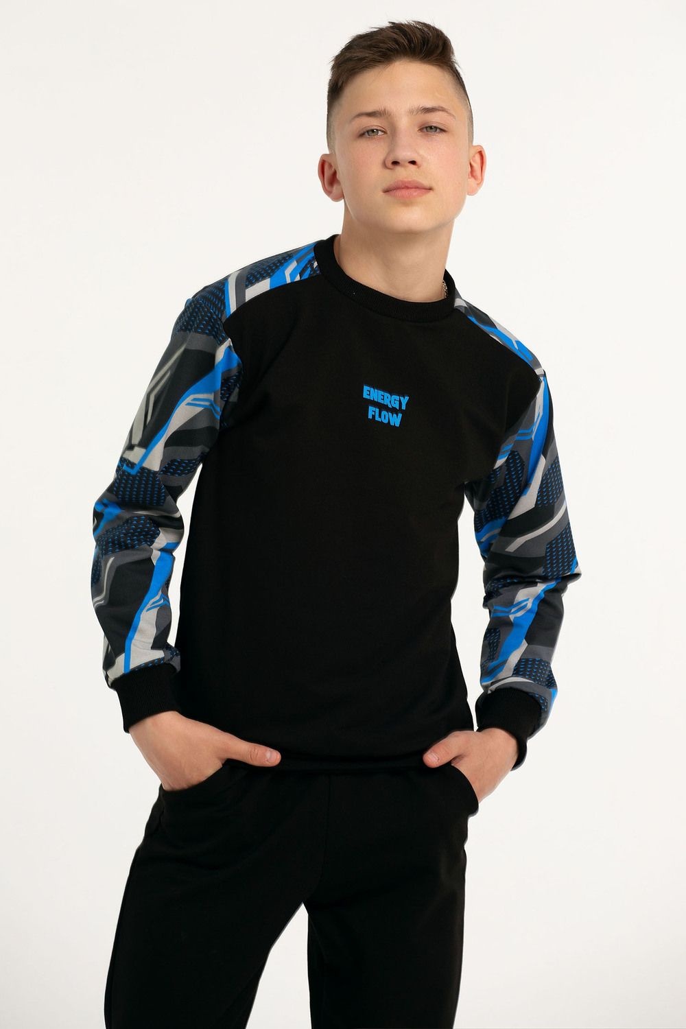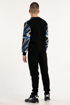 Костюм свободного кроя выполнен из футера 2-х нитки. Состоит из толстовки и брюк. Толстовка с манжетами и поясом из эластичного трикотажа. Рукав втачной со спущенной линией плеча. Брюки свободной посадки с карманами и манжетами из эластичного трикотажа.