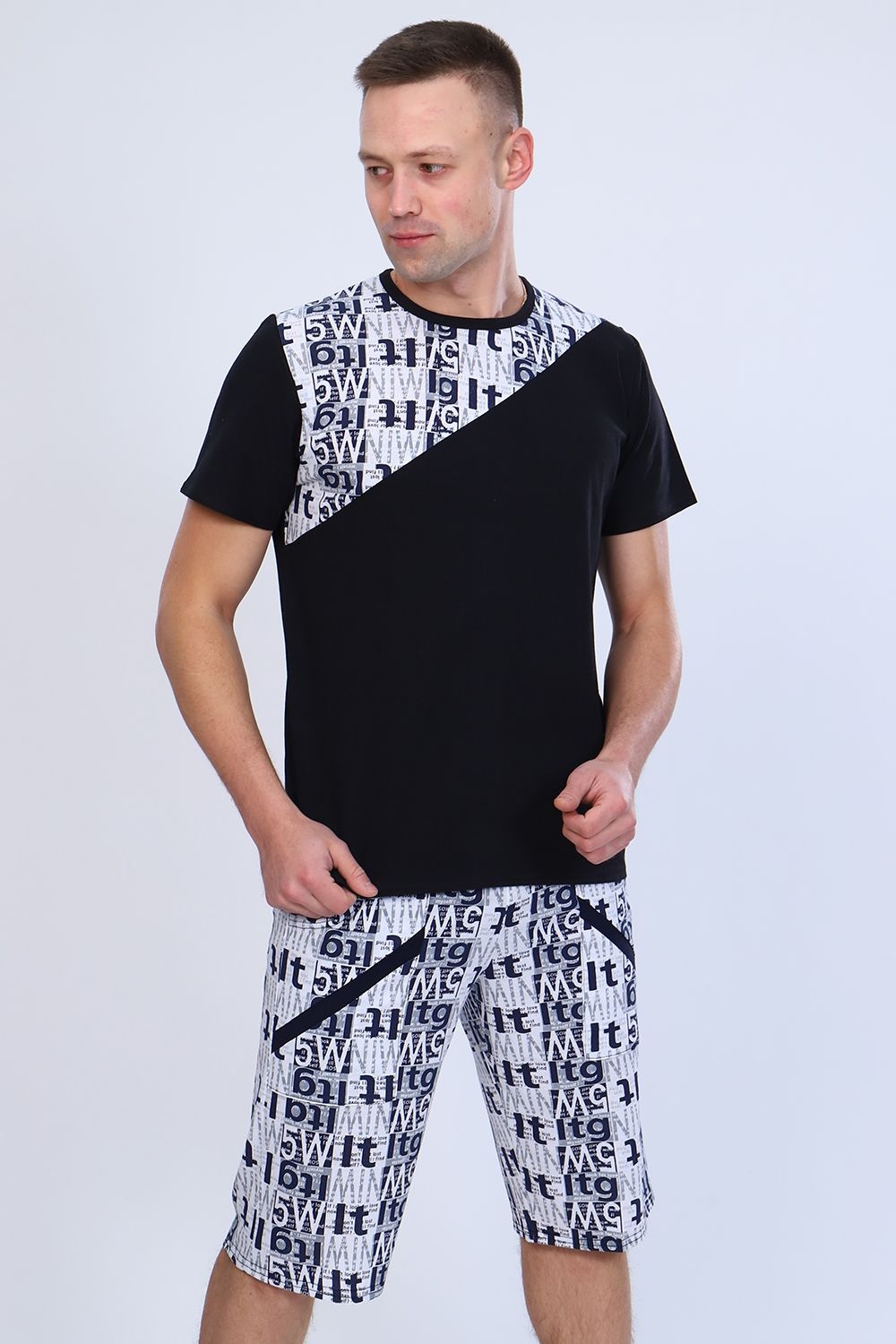 Мужской костюм состоит из футболки и бриджей. Бриджи с карманами, длина чуть ниже колена. Есть черный и серый цвет, состав серого цвета верх: 60% хб + 40% ПЭ; низ: 60% ХБ+ 40% ПЭ и черного цвета верх: 55% хб + 40% ПЭ + 5% эластан; низ: 60% хб + 40% ПЭ. Комплект костюма состоит из широкого размерного ряда. Отличный и удобный вариант на каждый день.