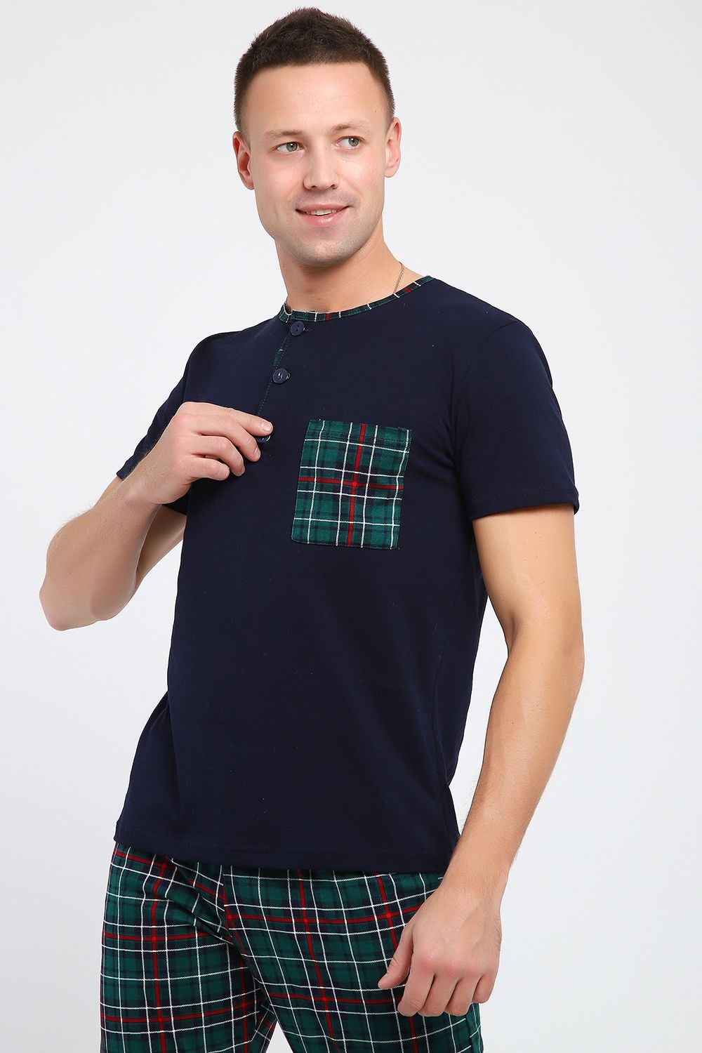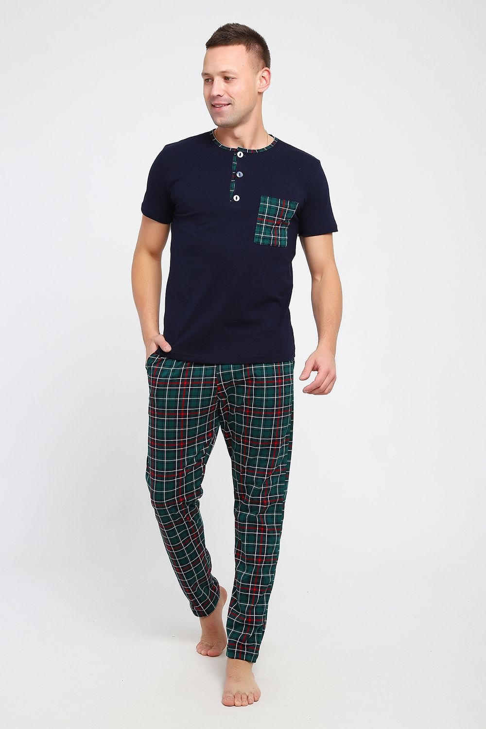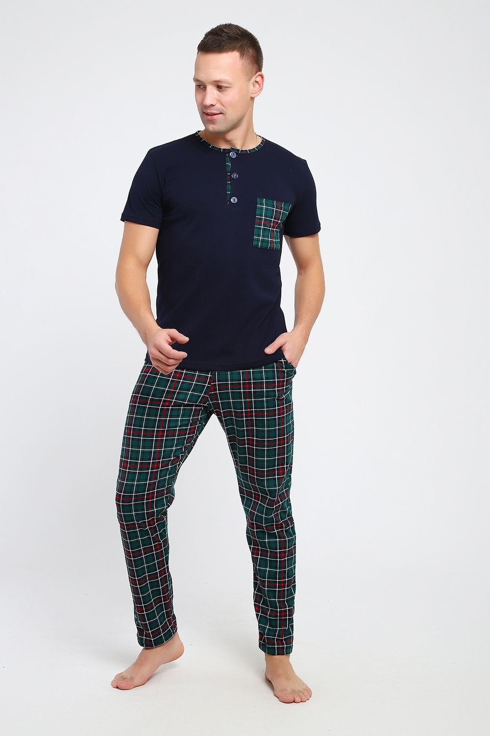 Мужской пижамный костюм футболка с брюками. Брюки полной длины слегка заужены к низу, с вместительными карманами по бокам. Футболка с коротким рукавом модель поло с пуговицами, на груди накладной кармашек.