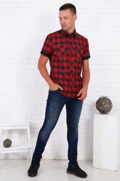 Рубашка мужская с черно-красной клеткой, рукав короткий с манжетом, на груди 2 кармана с пуговицами, низ рубашки овальный.