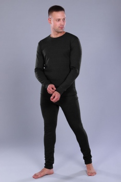 Нательное белье с фуфайкой и кальсонами. Горловина фуфайки с отделкой обтачка, рукава с манжетами. Кальсоны на резинке с ластовицей и манжетами внизу.