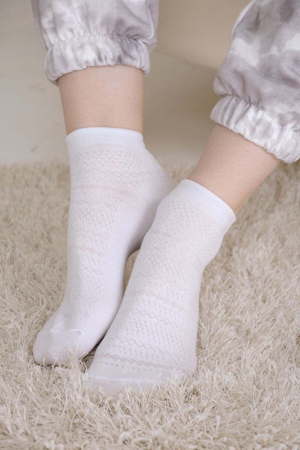 Ажурные женские носочки в спокойных оттенках - бежевом и белом. На резинке, по верху ажурный рисунок, по стопе - гладкие. В упаковке 3 пары одного цвета.