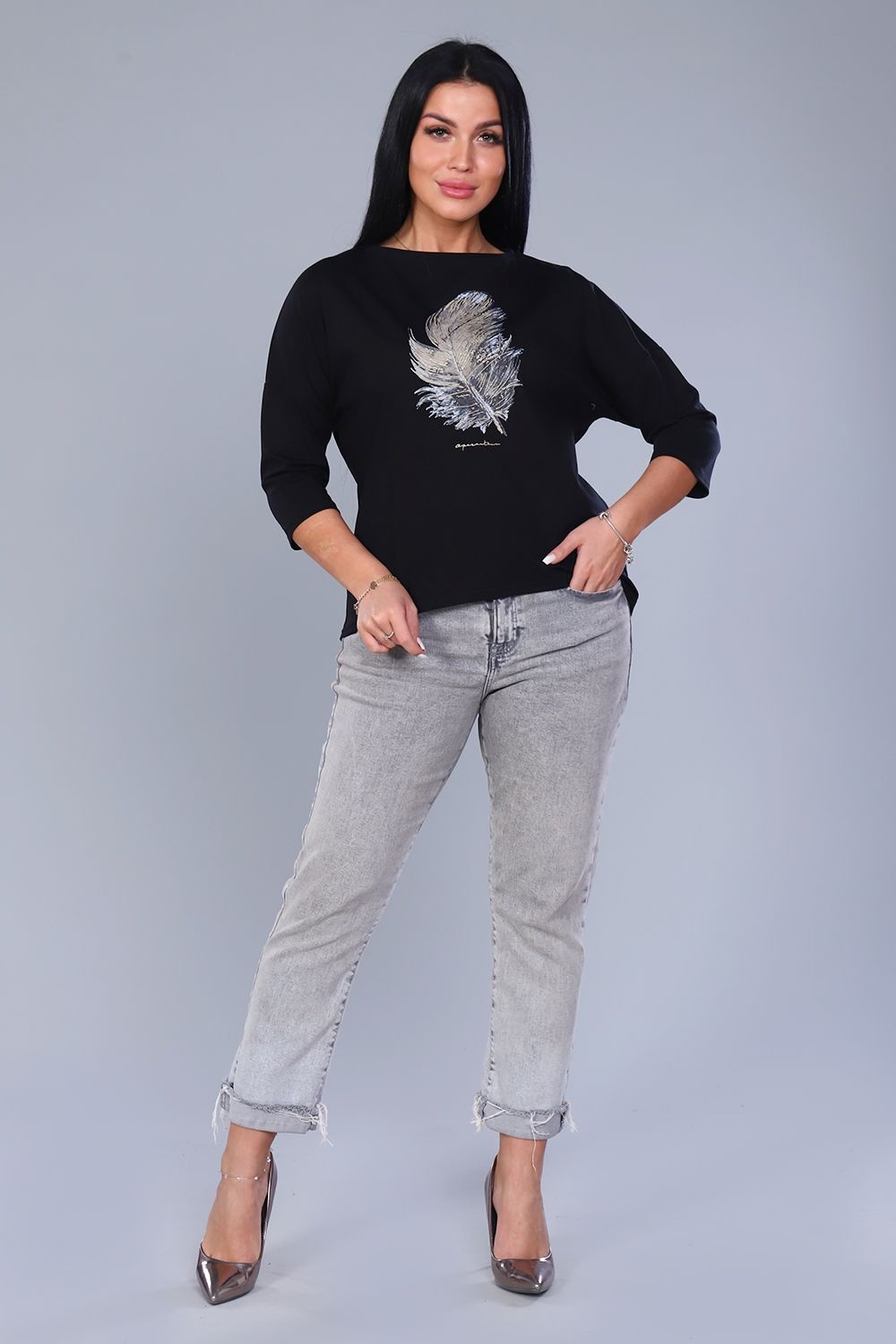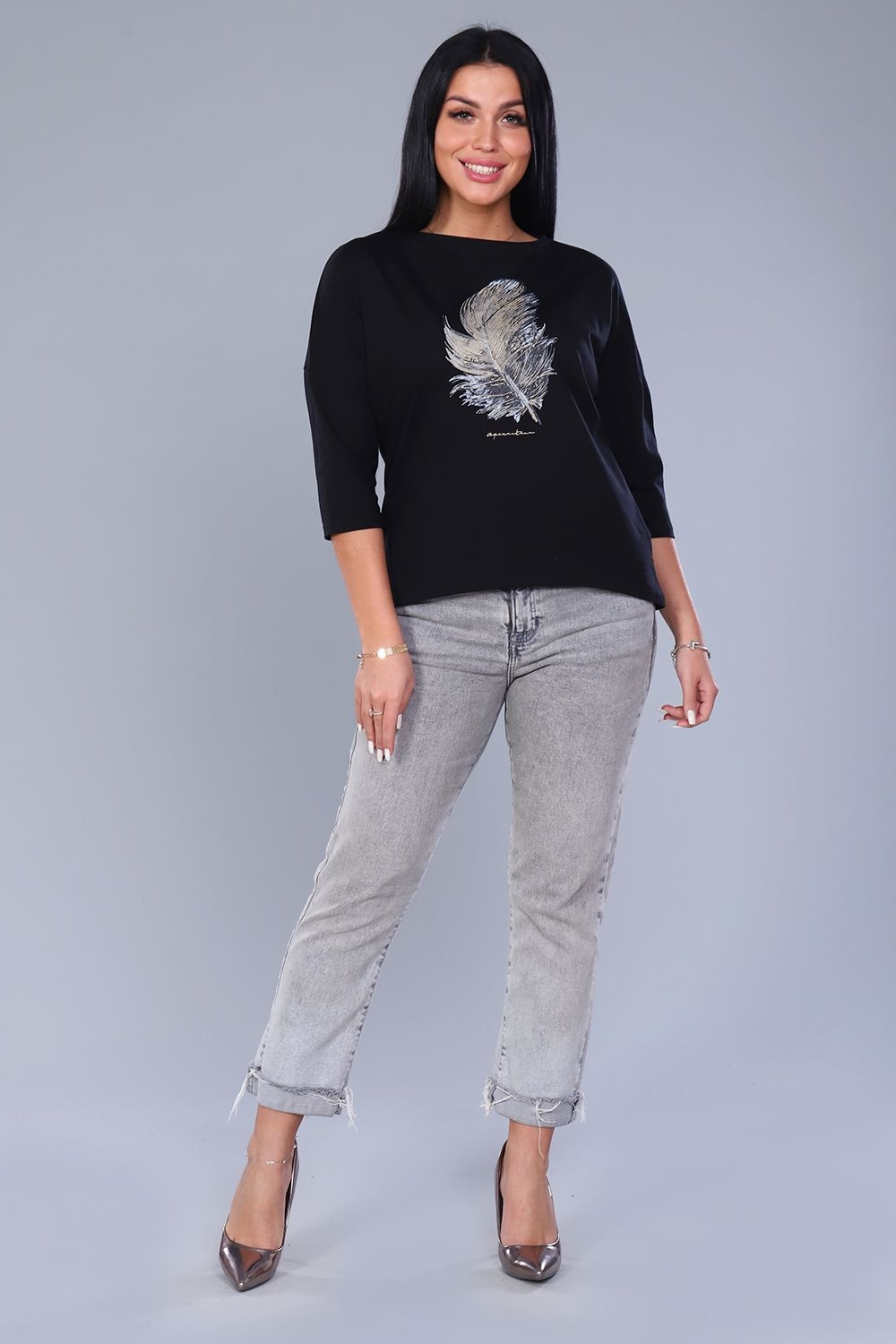 Джемпер женский с мерцающим принтом 3Д в виде пёрышка, из плотной кулирки с лайкрой качества пенье. Модель слегка приталенного силуэта, горловина круглая обработана обтачкой, спущенное плечо, рукав 3/4, спинка слегка удлинена и закруглена. Джемпер стильный, лёгкий, приятный к телу, отличный офисный вариант. Модель дополнит любой образ и создаст настроение от элегантного до вечернего.