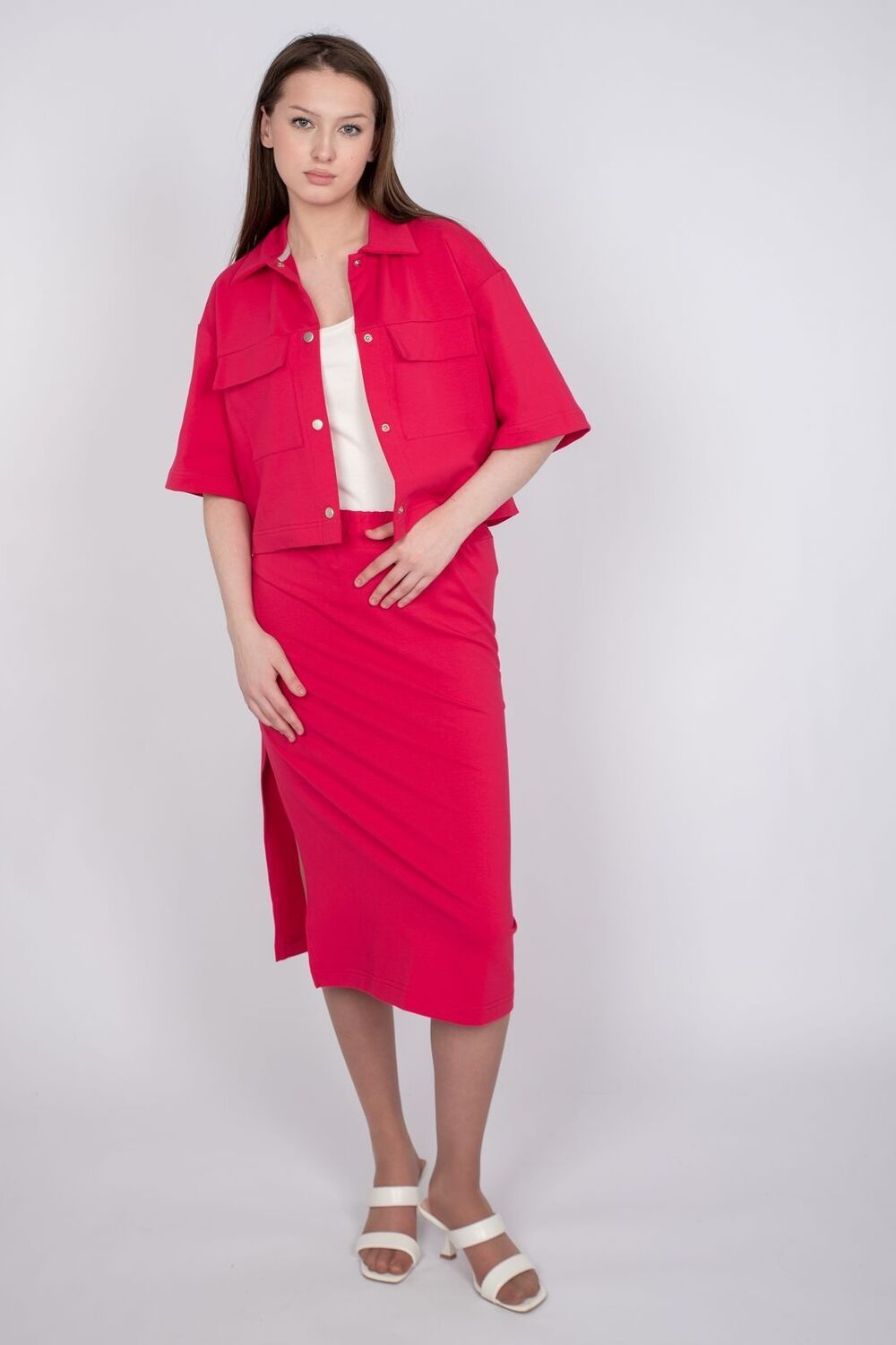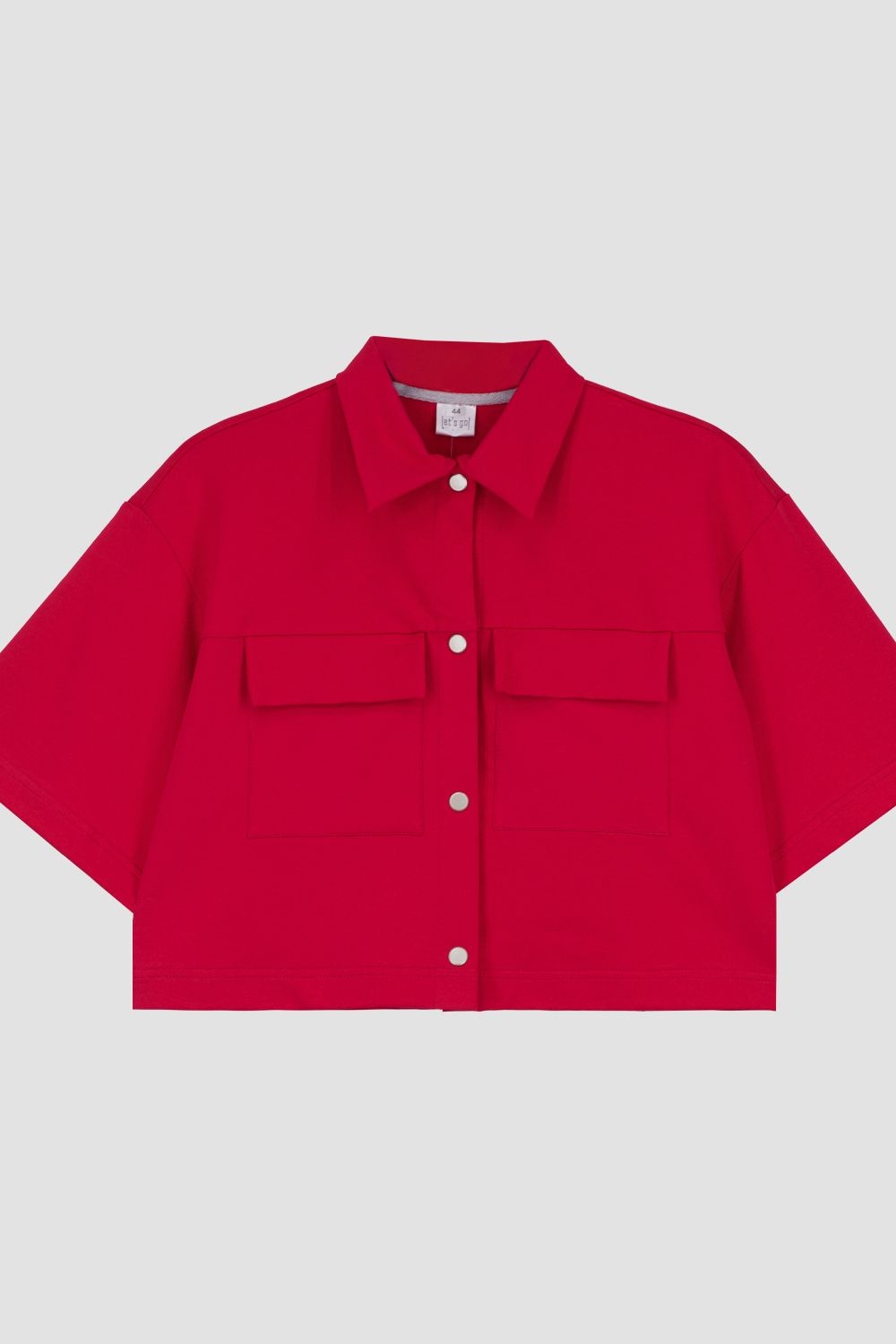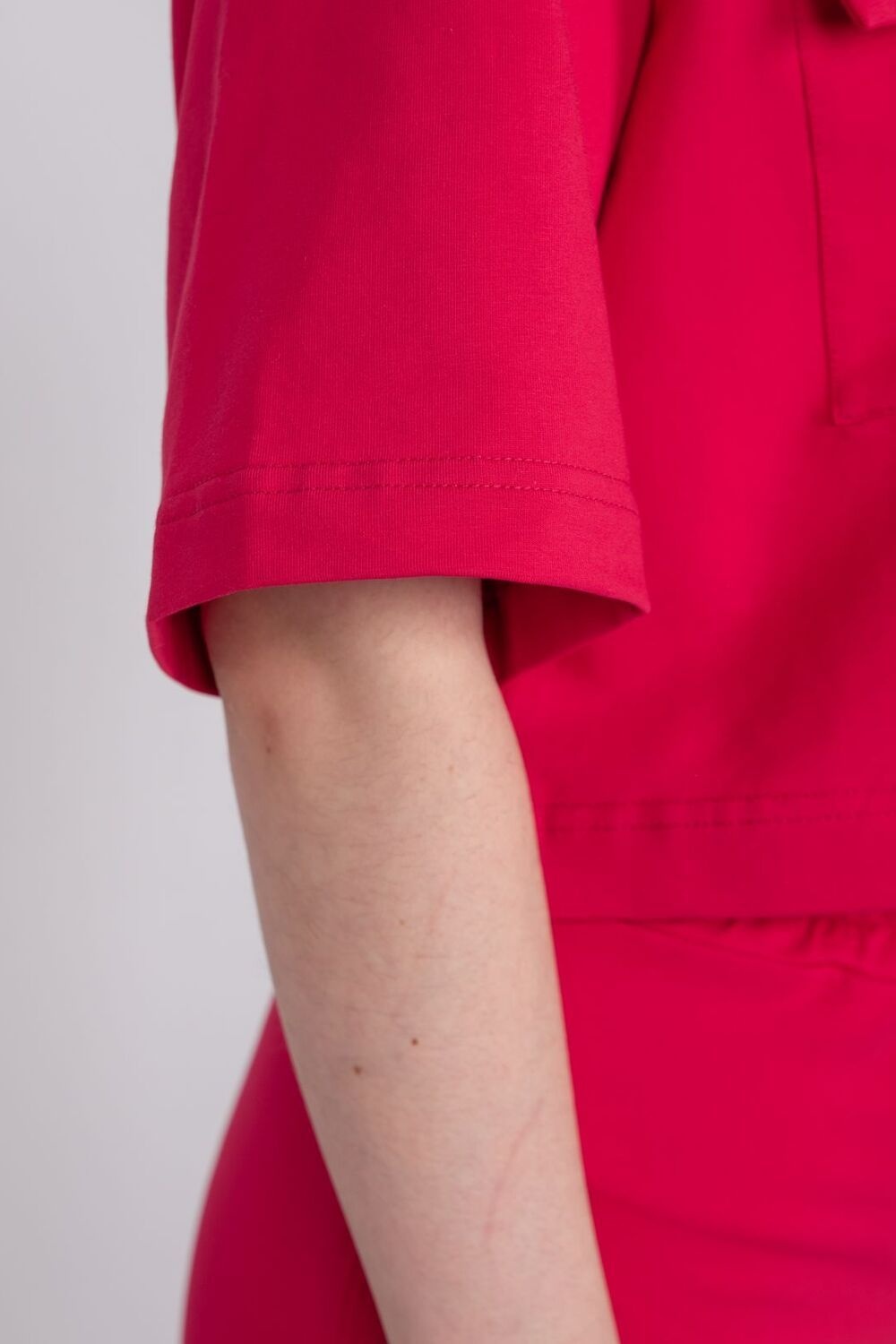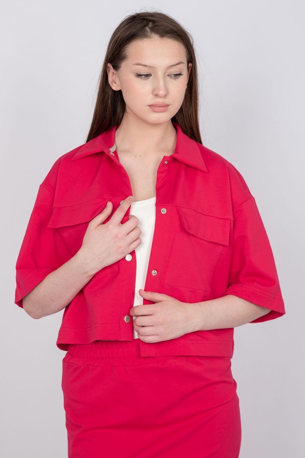 Джемпер женский свободный кроя, со спущенной линией плеча. Горловина круглая обработана классическим воротником с цельнокроенной стойкой из основного полотна. Линия борта обработана подбортом. На полочке отрезная кокетка и накладные карманы с необработанными краем. Вход в карман прорезной. Низ рукава и низ изделия не обработан. Модель рассчитана на рост 164-170