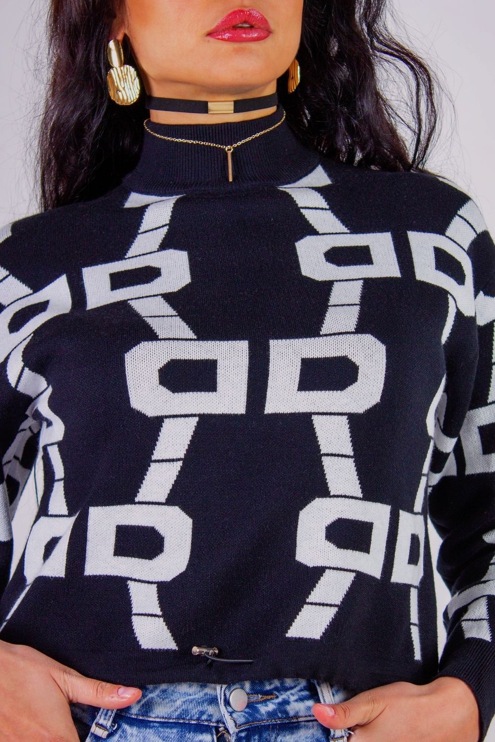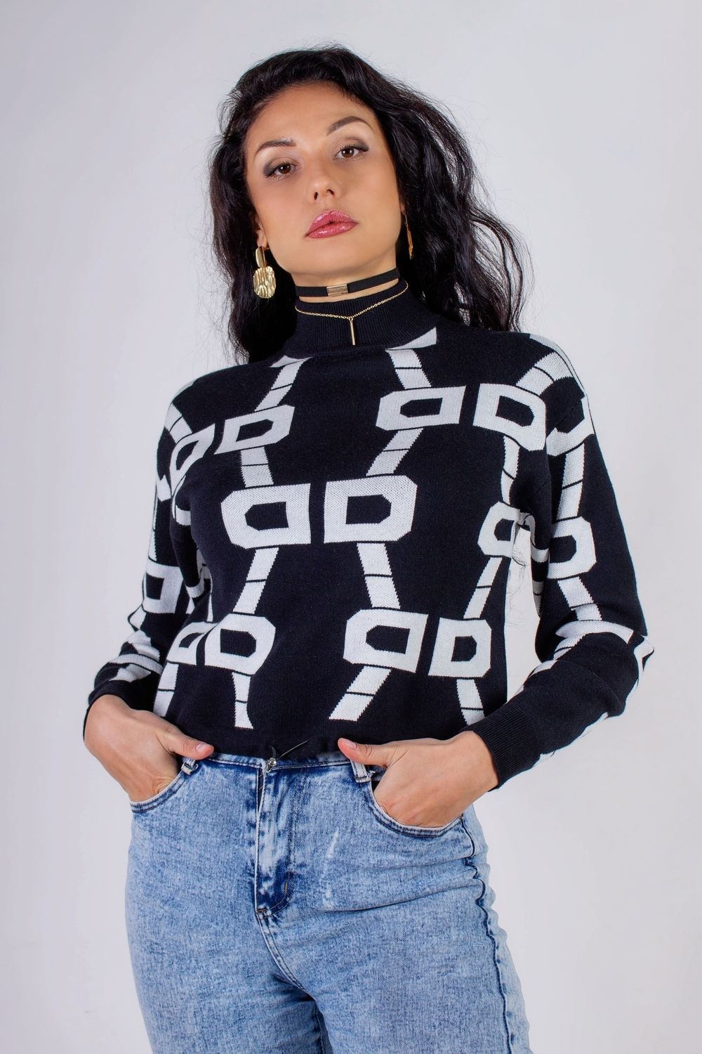 Стильный и модный укороченный джемпер с фиксатором по талии станет незаменимой частью вашего гардероба в любом сезоне. Этот джемпер выполнен в черно-белой гамме с эффектным графичным рисунком, который не только привлекает внимание, но и визуально стройнит силуэт.