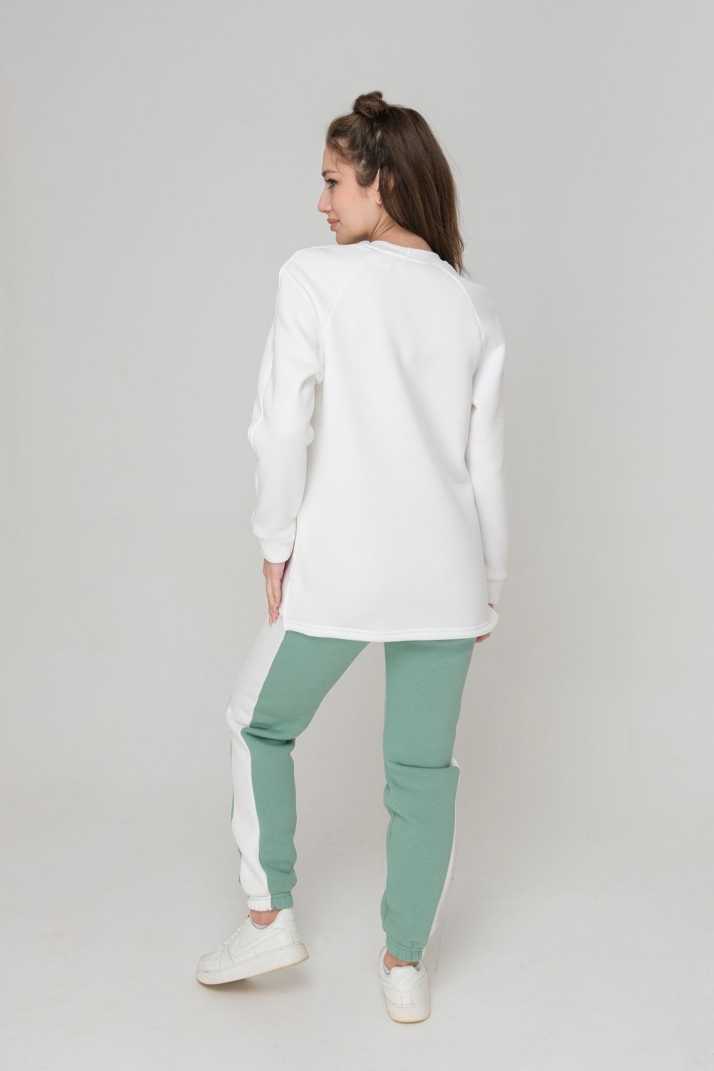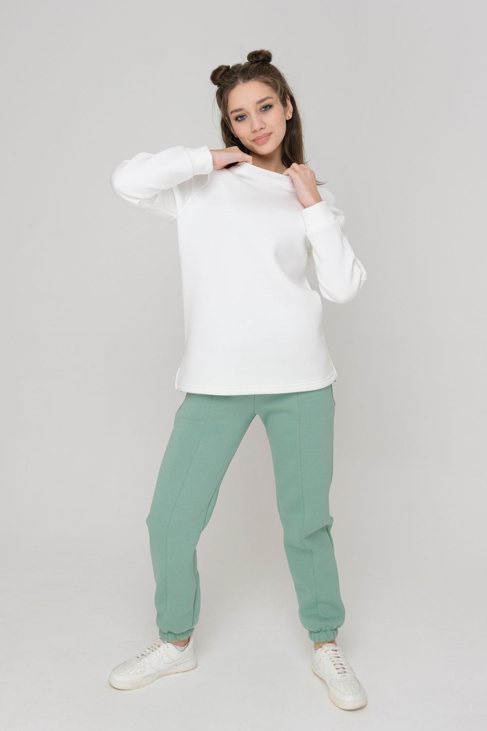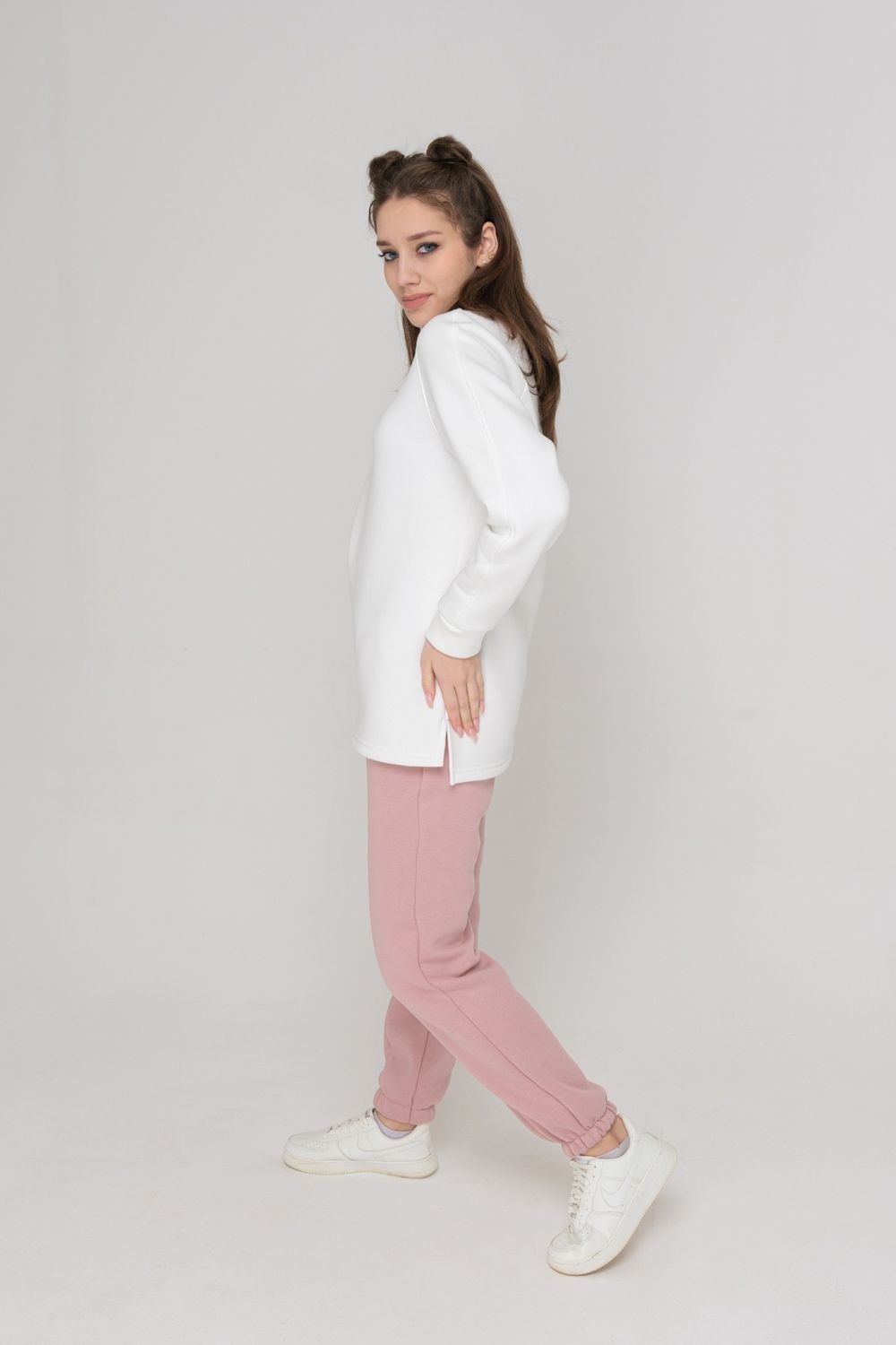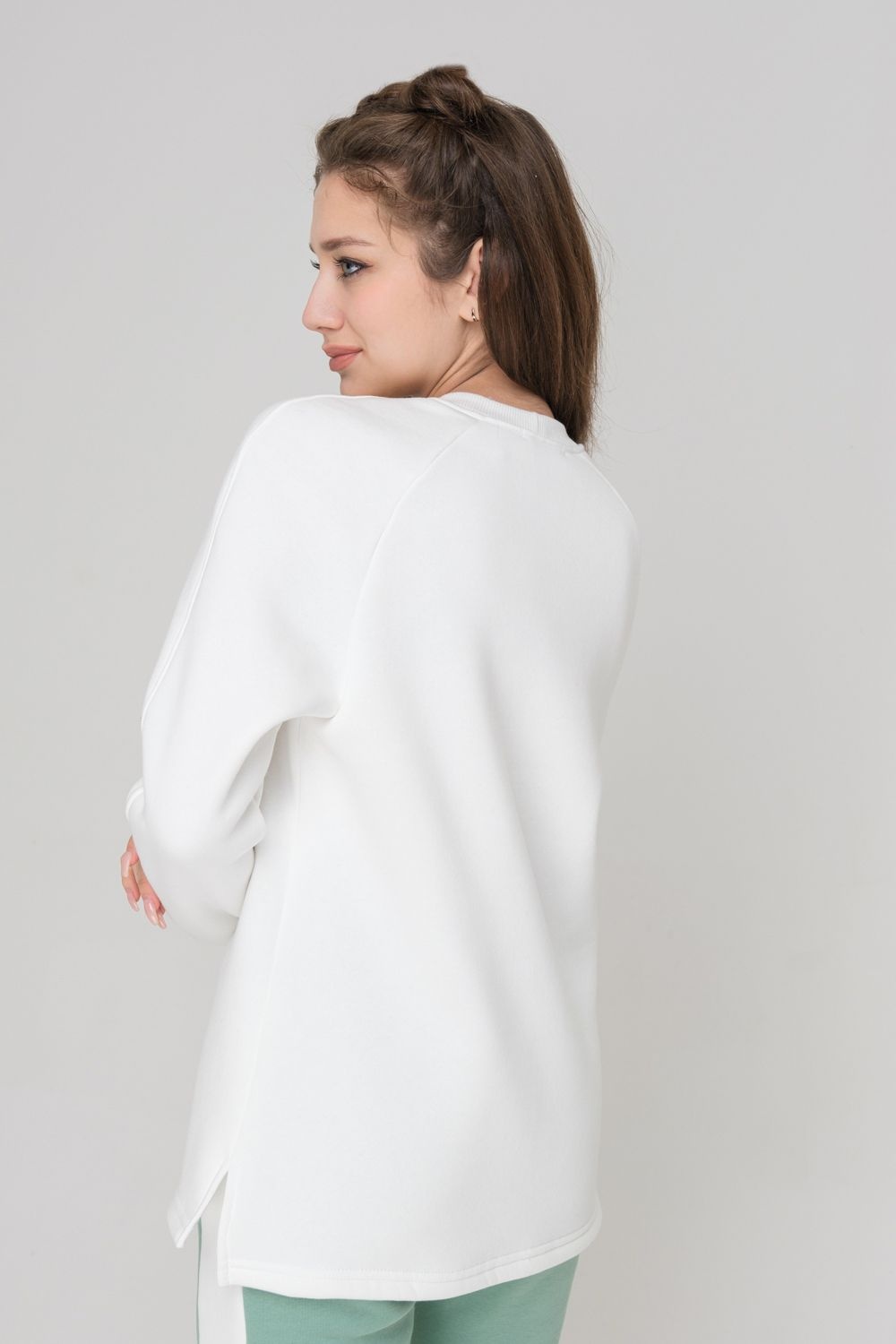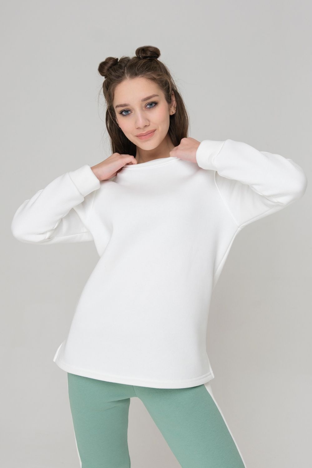 Толстовка утепленная, прямая, с округлой горловиной, с удлиненной спинкой. Рукав реглан, длинный, на манжете. Горловина обработана эластичной обтачкой. В нижней части боковых швов обработаны разрезы.