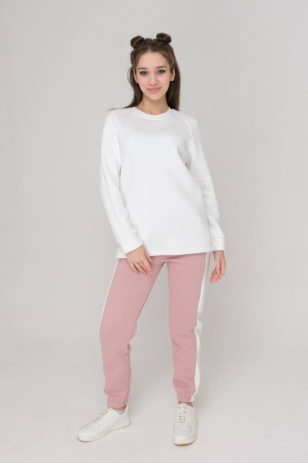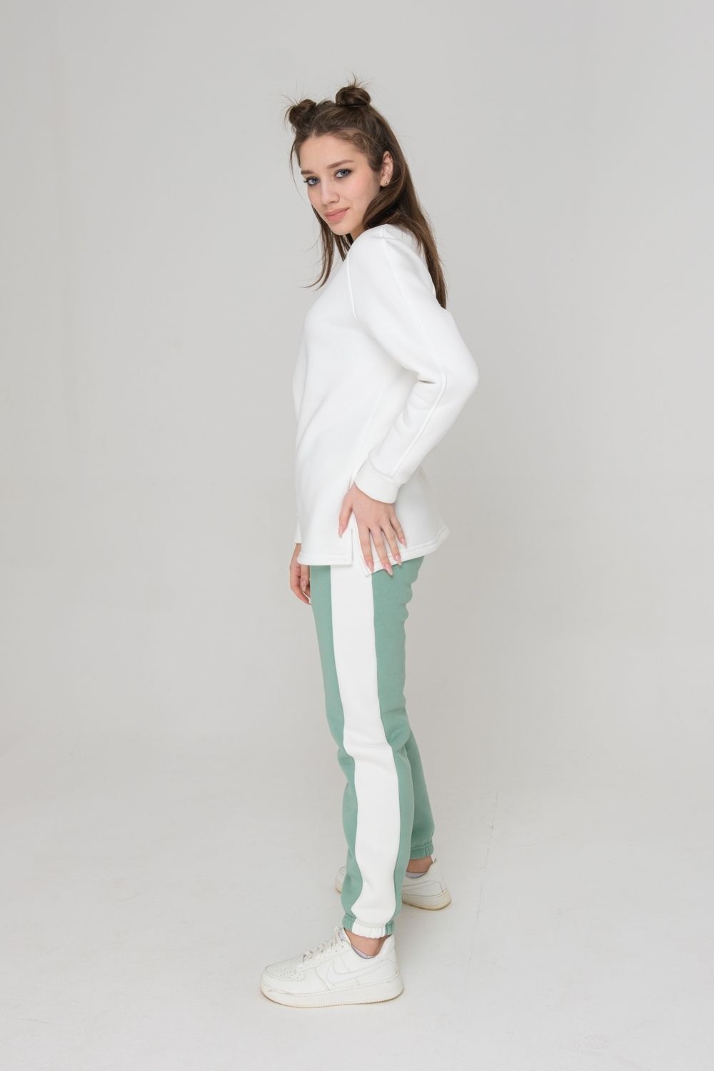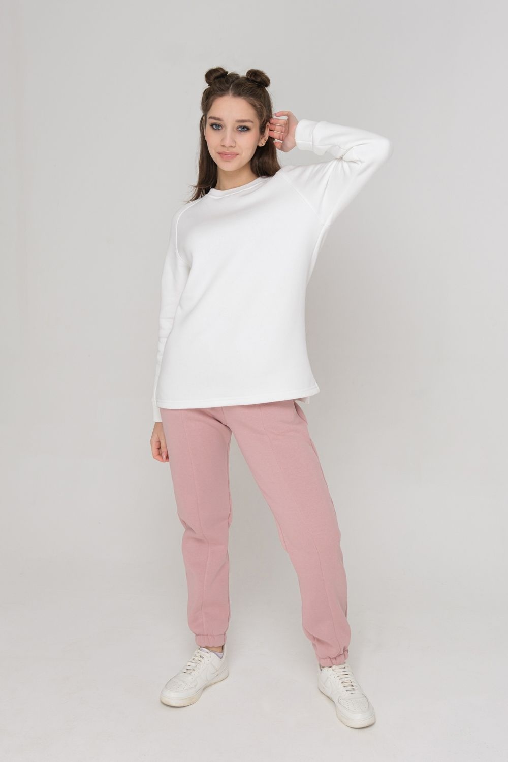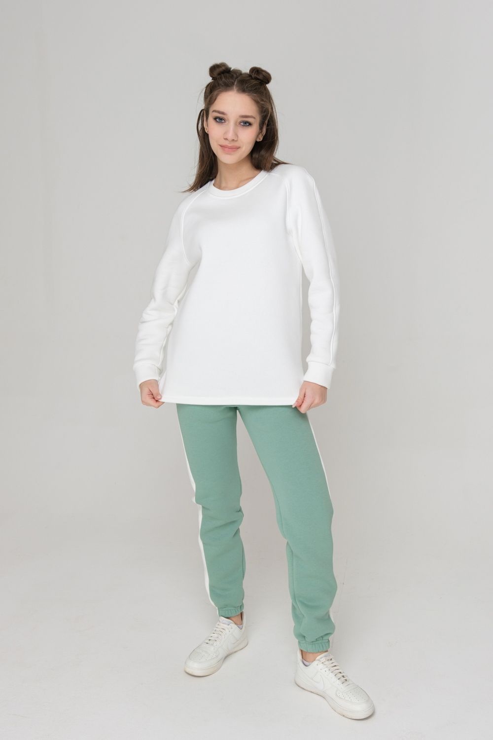 Толстовка утепленная, прямая, с округлой горловиной, с удлиненной спинкой. Рукав реглан, длинный, на манжете. Горловина обработана эластичной обтачкой. В нижней части боковых швов обработаны разрезы.