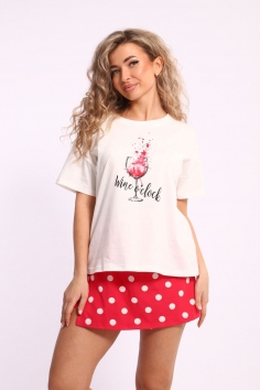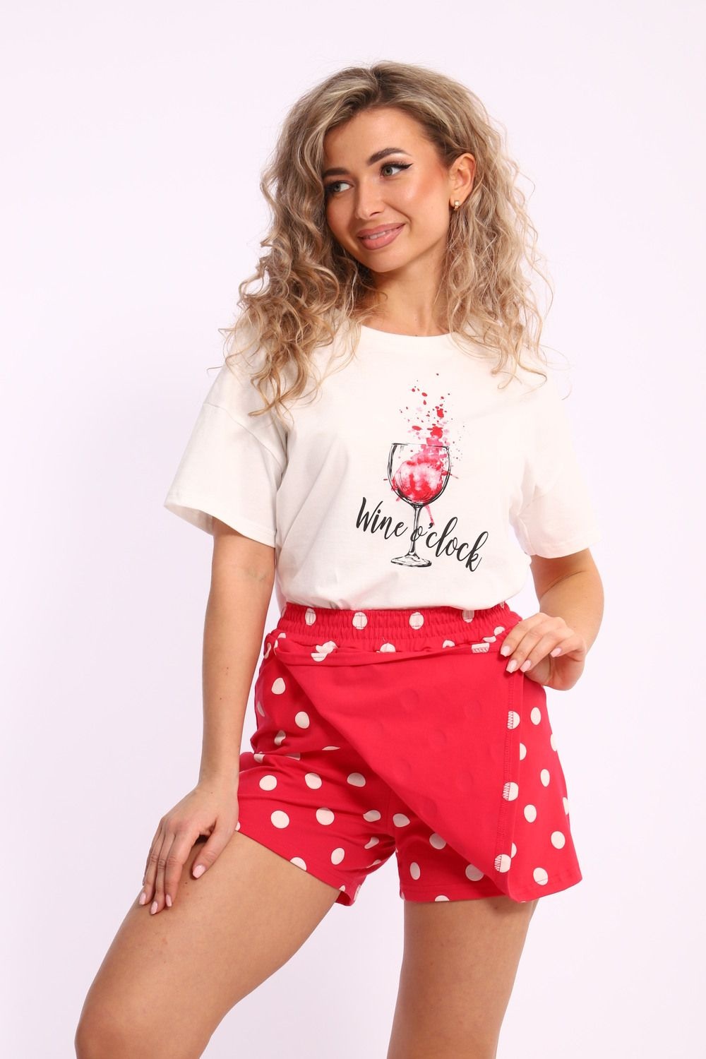 Костюм комбинированный женский, футболка с шортами-юбка. Футболка выполнена из трикотажного полотна кулирка (хлопок 100%), свободного покроя со спущены коротким рукавом. На полочке присутствует принт. Шорты-юбка выполнена из эластичного трикотажного полотна кулирка с лайкрой (хлопок92%, лайкра 8%). Пояс отдельный с отстрочками. Отличная модель для отдыха и дома.