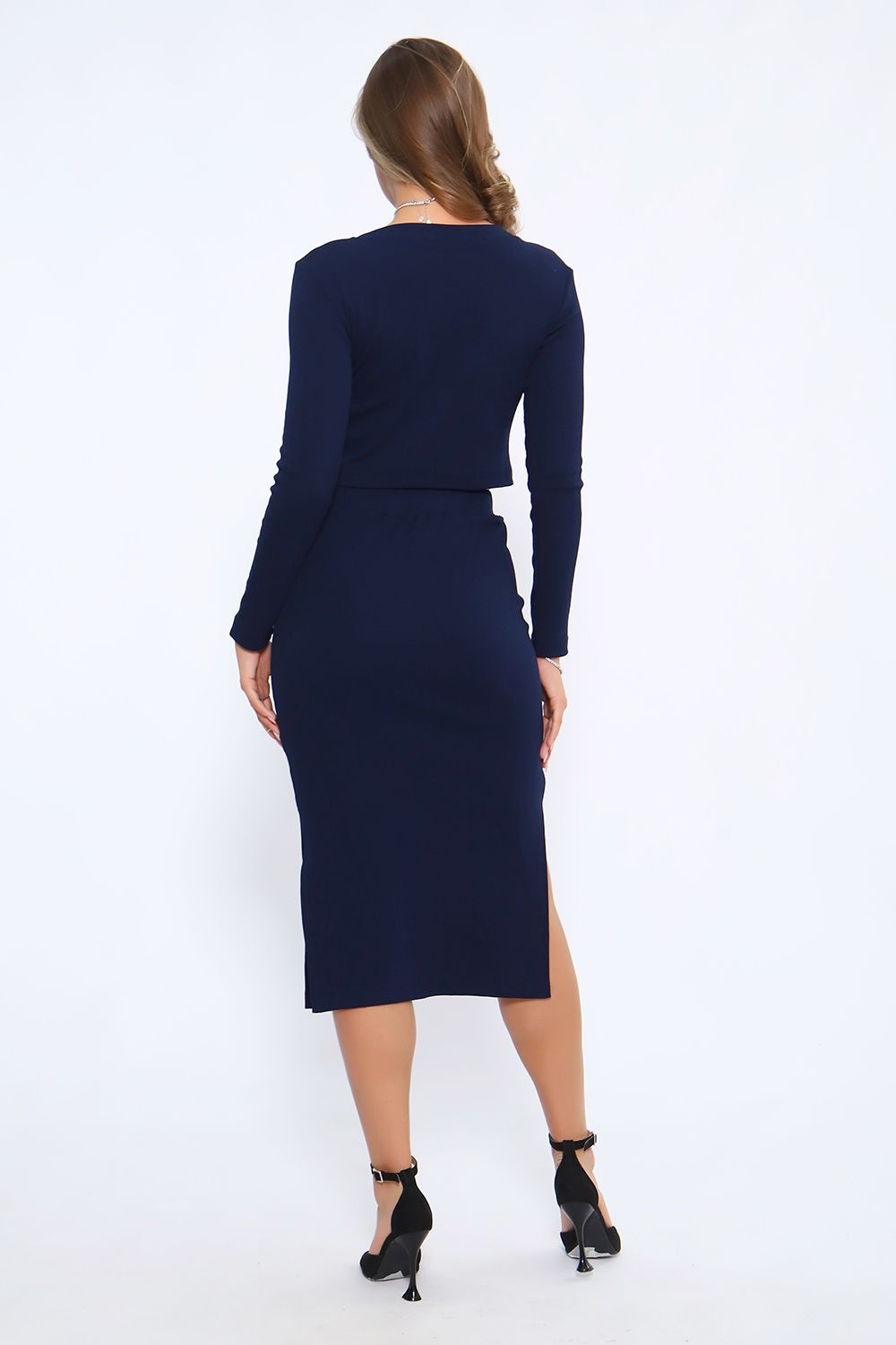 Костюм состоит из топа с длинными рукавами и юбки с двумя разрезами в боковых швах. Замеры без учета растяжения ткани.