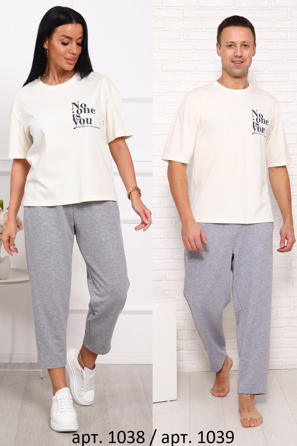 Костюм женский: футболка свободного кроя, с короткими рукавами и с лаконичным принтом на груди; брюки укороченные с боковыми карманами, на эластичном поясе. Данный костюм вместе с мужским костюмом (арт. 1039) составляет образ Family look.