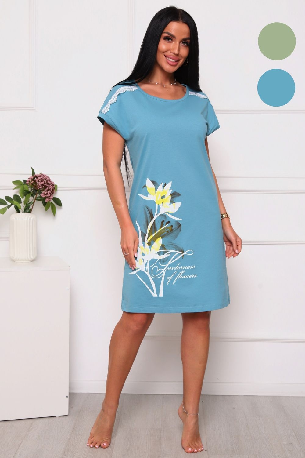Сорочка женская полуприлегающего силуэта. Длинна чуть выше колена, плечо спущенное без рукава. Горловина круглой формы, обработана окантовкой. На полочке располагаются две небольшие кокетки в районе плеча с кружевом. Принт (шелкография) располагается по низу изделия с правой стороны.