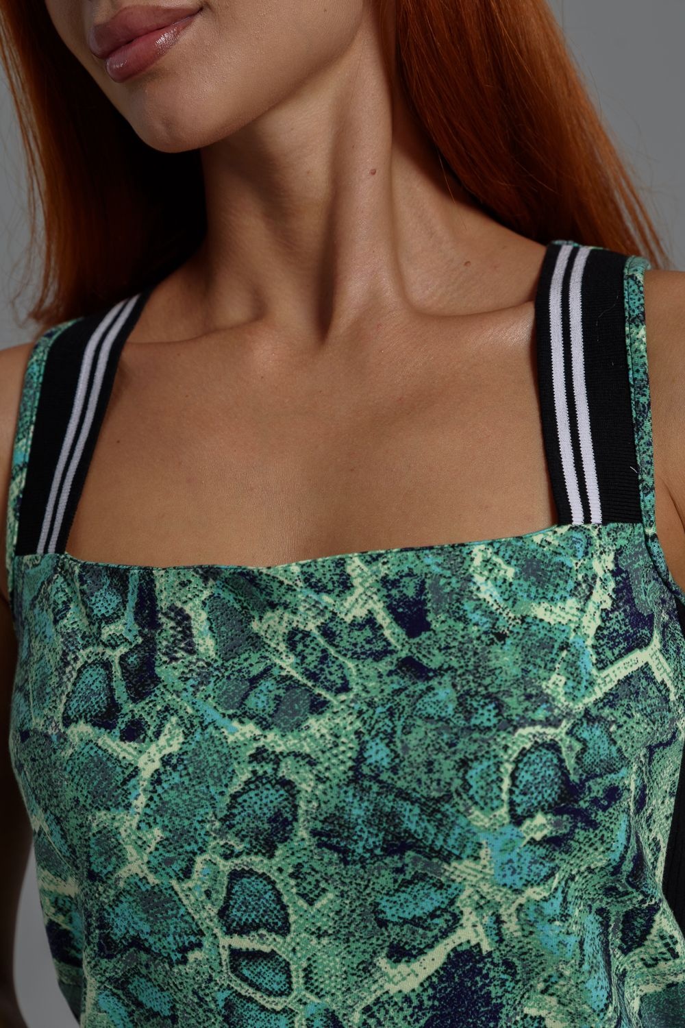 Платье полуприлегающего силуэта, с крадратным вырезом спереди и 'борцовкой' сзади, длиной выше колена, без рукавов. Бретели на полочке выполнены из кашкорсе с контрастными полосами. Вдоль боковых швов расположены лампасы и накладные карманы из отделочного полотна. Горловина и проймы обработаны бейкой из основного полотна.