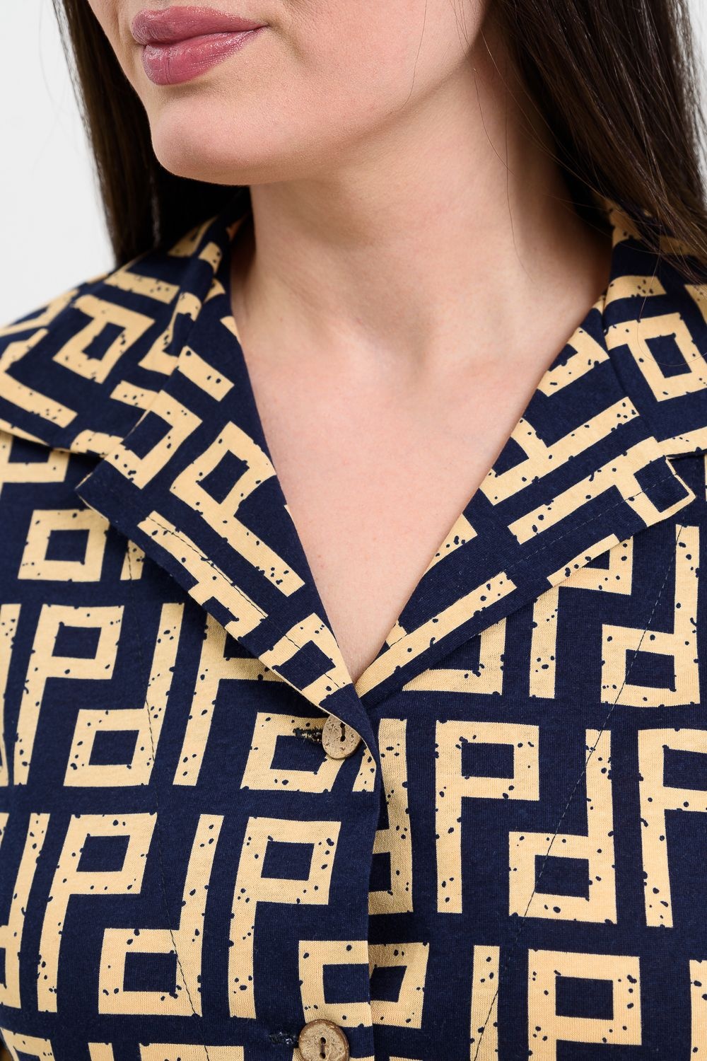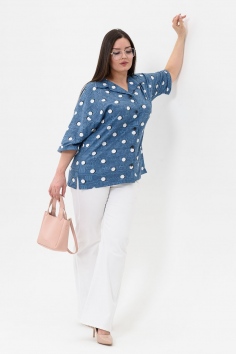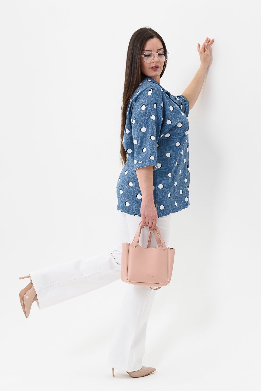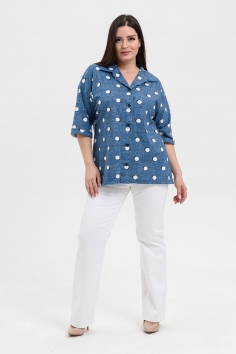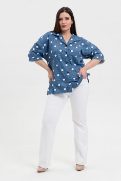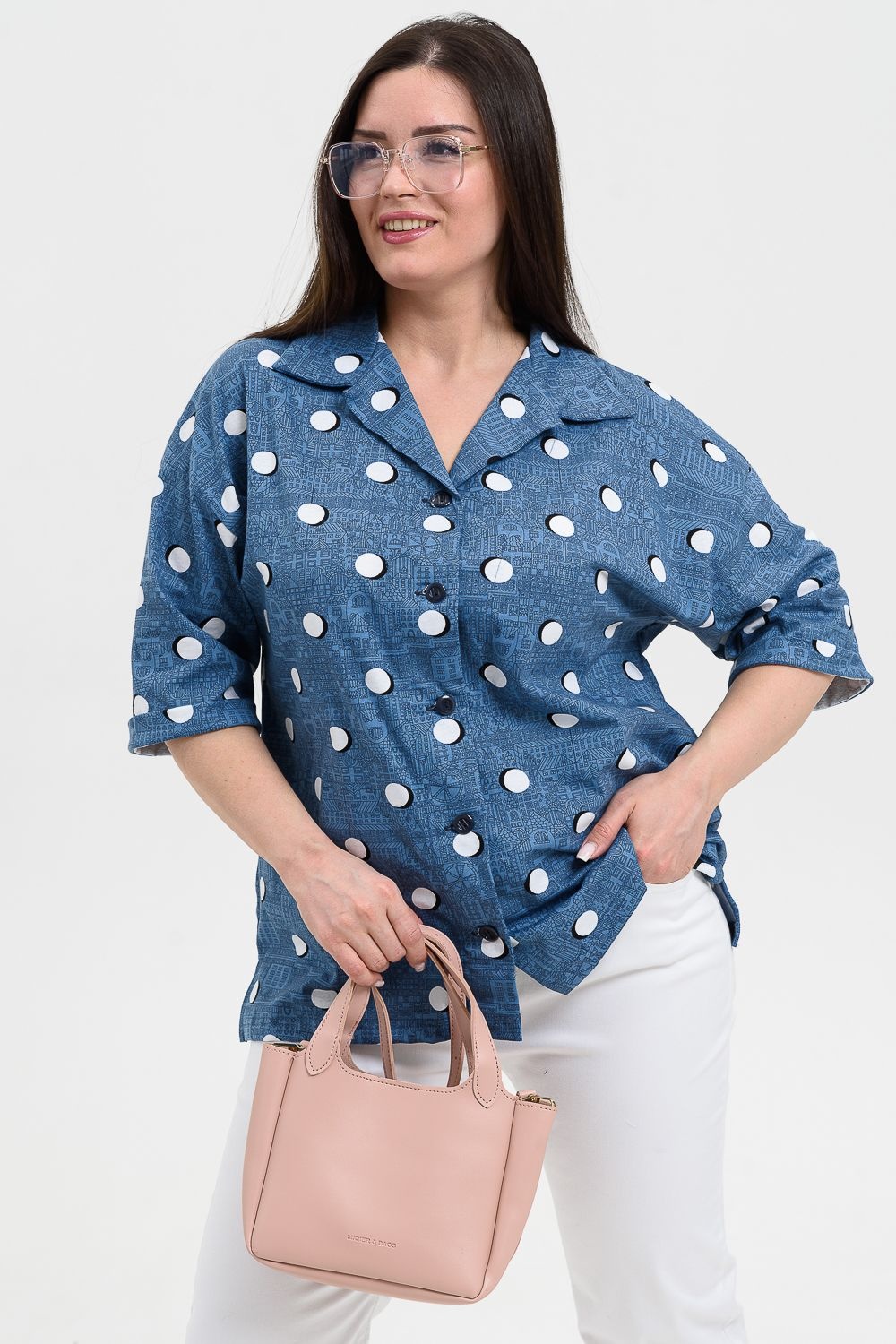 Рубашка-блузка из лёгкого мягкого трикотажного полотна прямого силуэта, на пуговицах, отложной воротник втачной рукав с манжетами, застёжка на пуговицах. Изделие хорошо сочетается с брюками, юбками, бриджами.