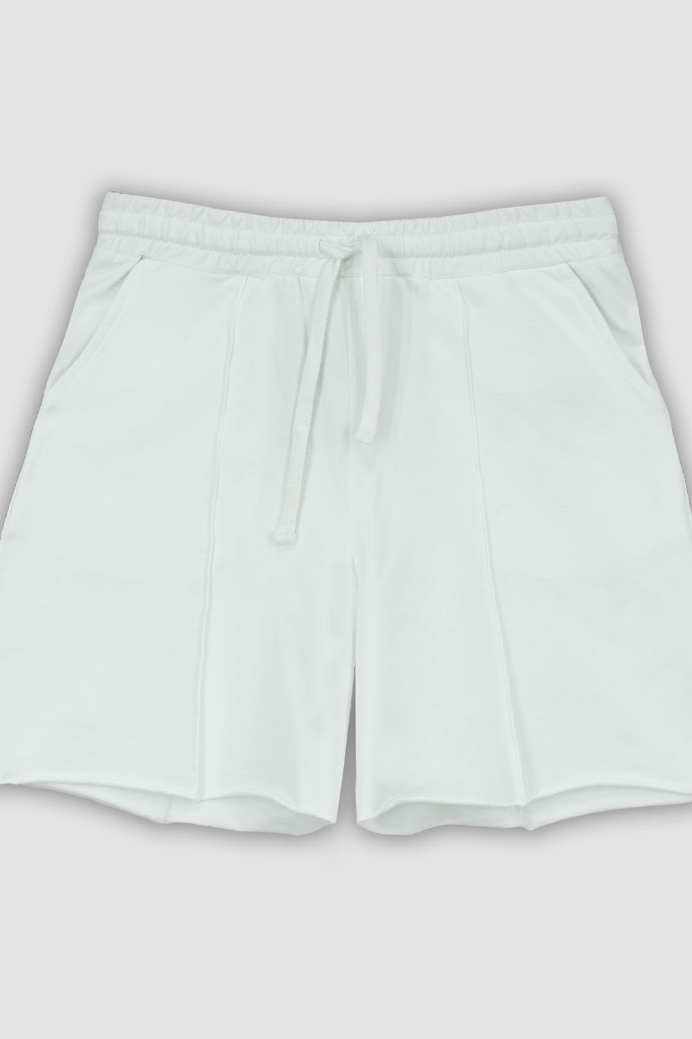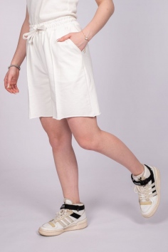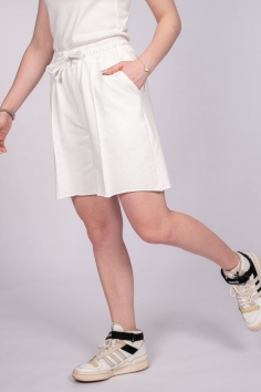 Шорты женские трапециевидного силуэта. Пояс отрезной в цвет изделия, выполнен из основного полотна, с эластичной тесьмой внутри. По поясу шорт вставлен плоский утягивающий шнурок, цвет серый меланж, низ шнурка подвернут и застрочен. Вдоль пояса шнурок закреплен отстрочкой на поясной машине. По центру передней и задней половинке шорт защип. На изделии выполнены карманы с отрезным бочком и отлетной мешковиной, вход в карман обтачной. Низ изделия не обработанный край. Модель рассчитана на рост 164-170