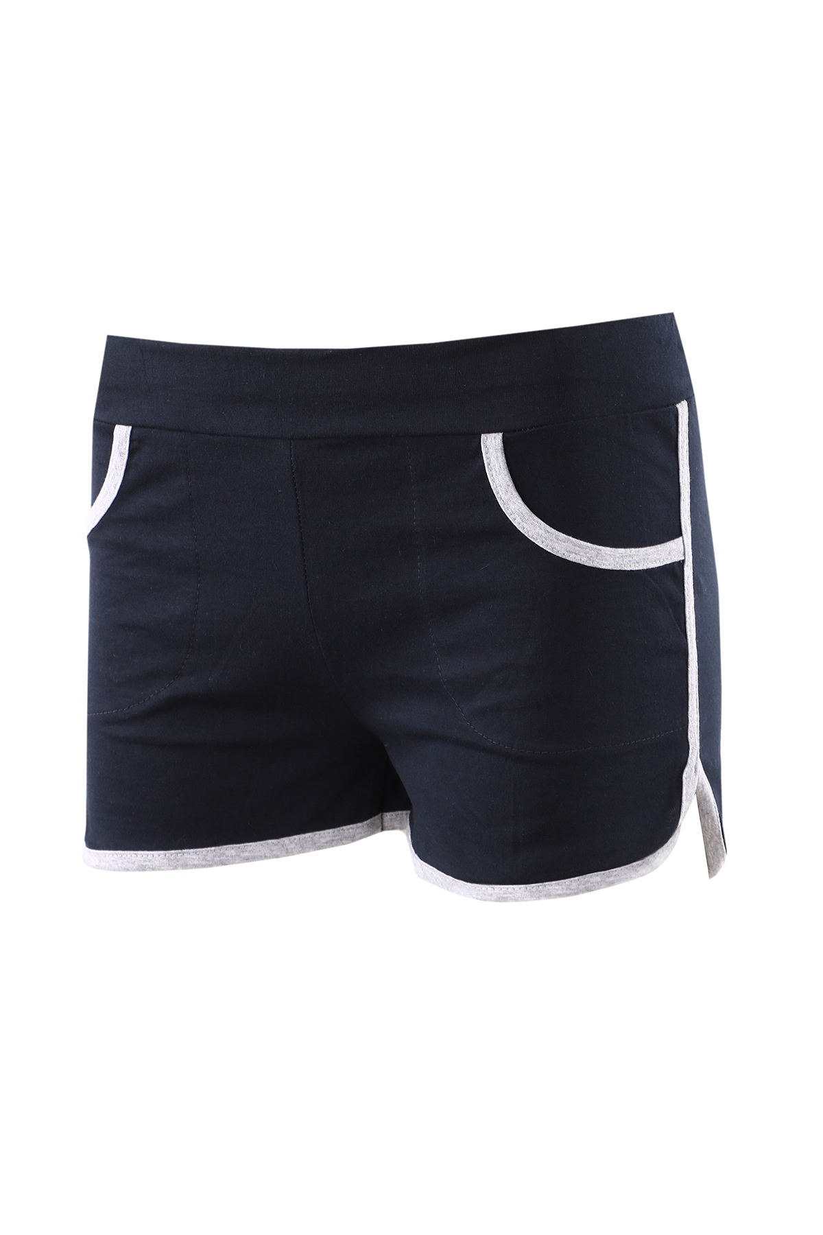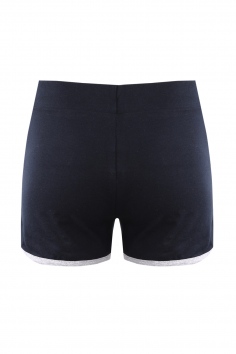 Шорты в спортивном стиле полуприлегающие, короткие, на декоративной резинке, с фигурным низом. Низ шорт обработан бейкой из отделочного полотна.