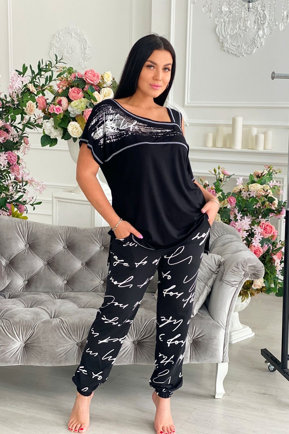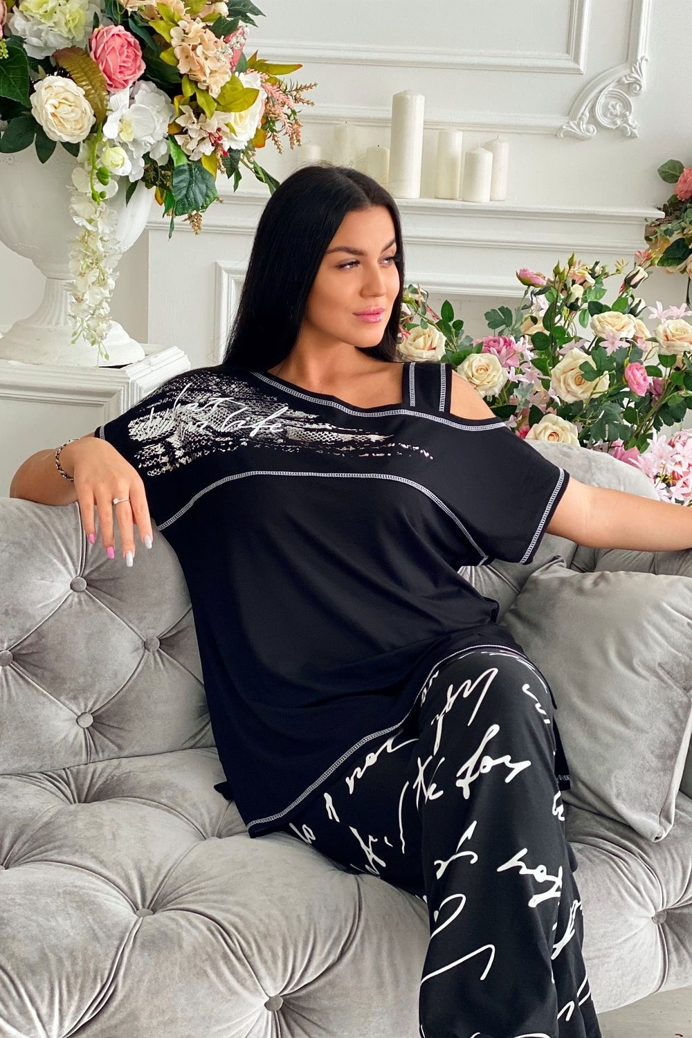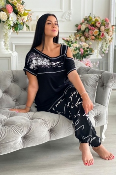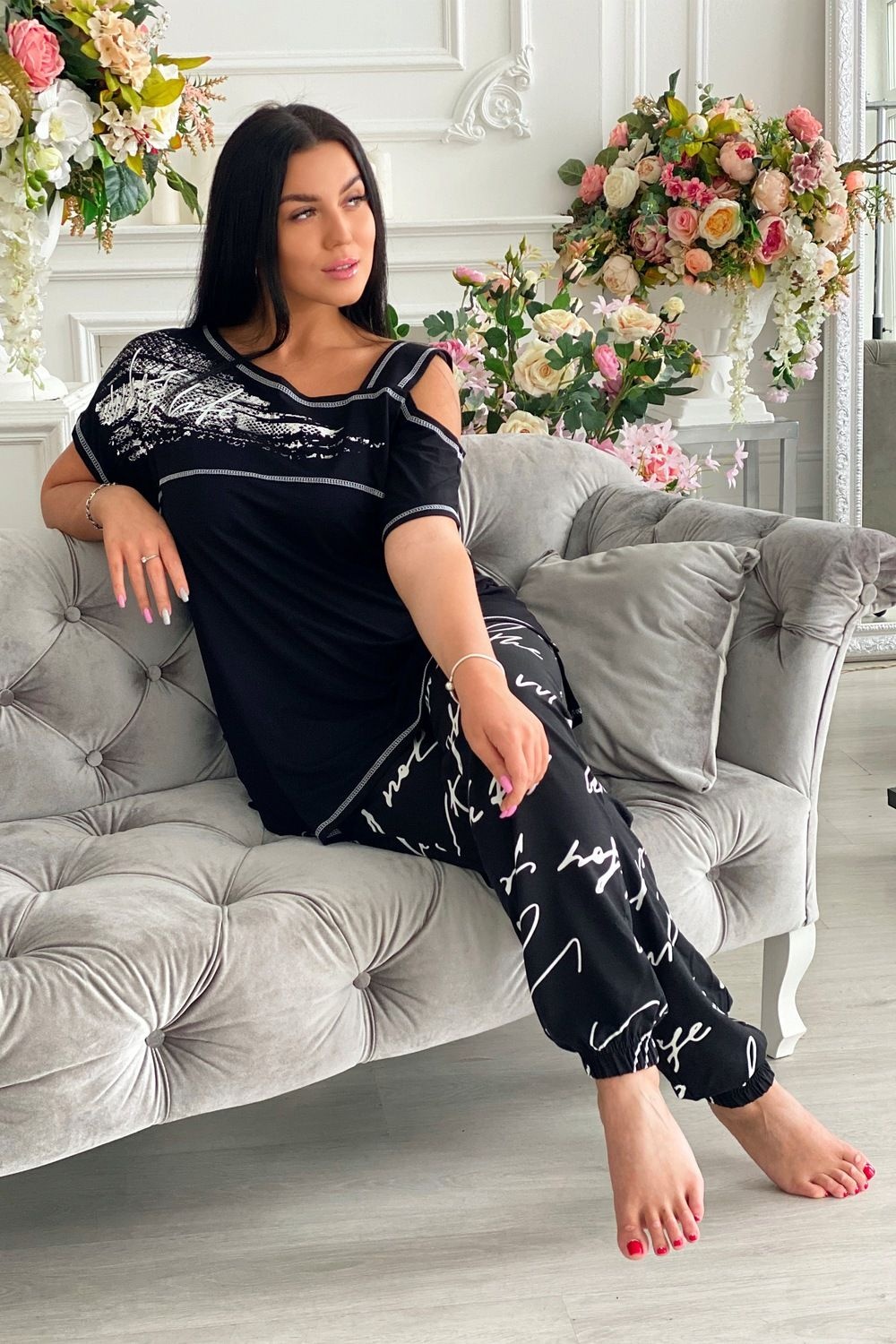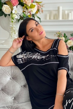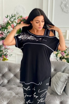 Туника женская полуприлегающего силуэта. Рукав цельнокроенный короткий, с одной стороны бретель на плече, в боковых швах разрезы. В верхней части полочки модный принт.