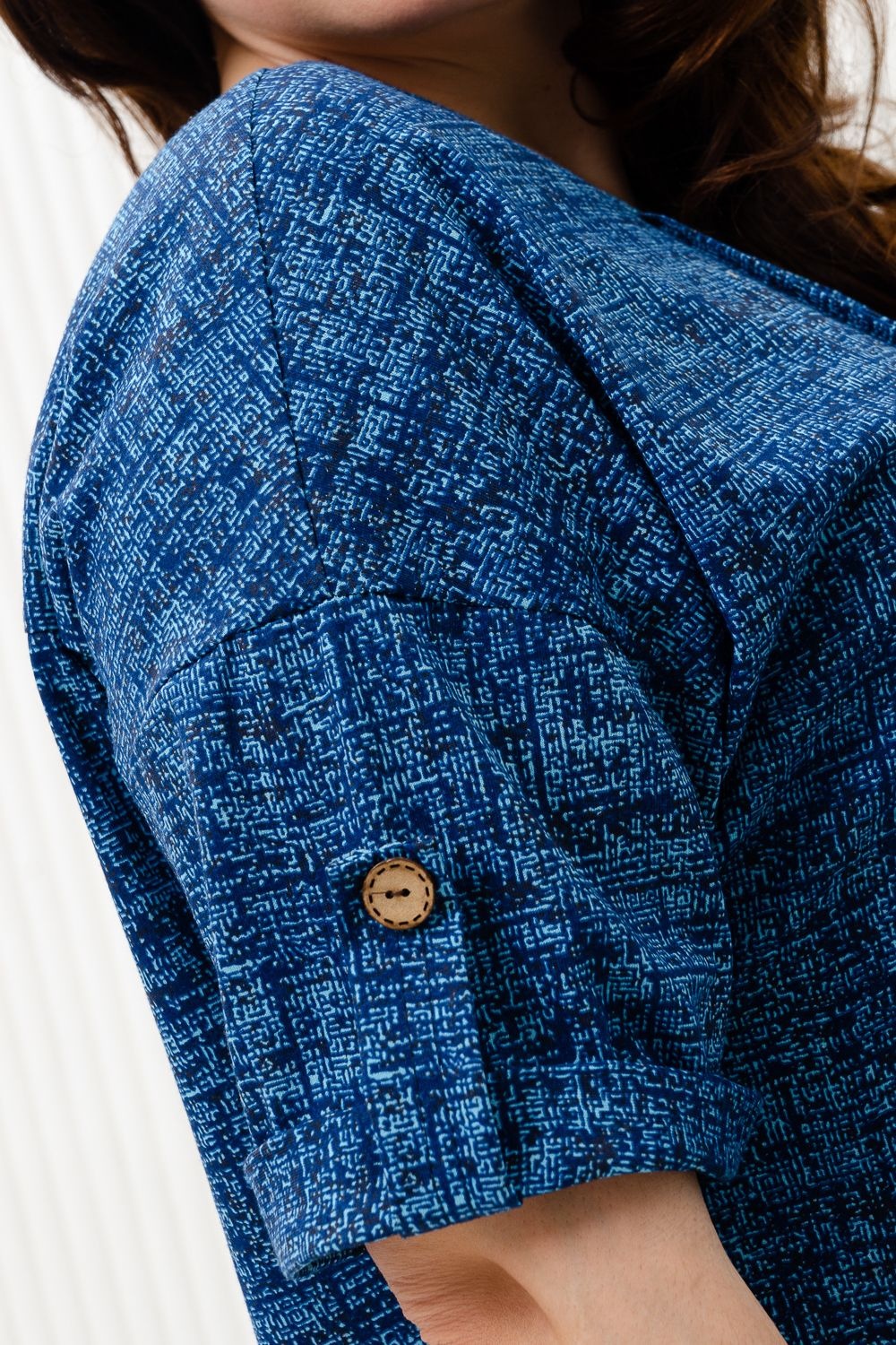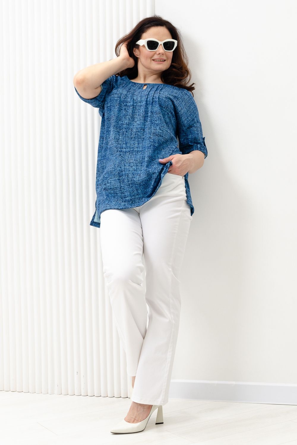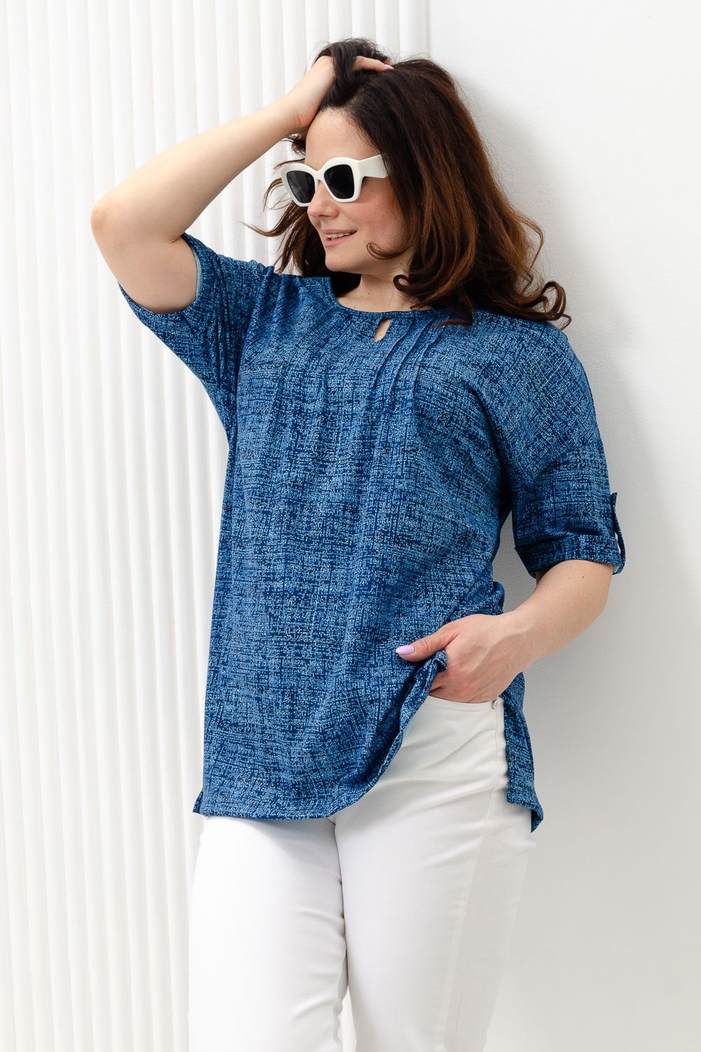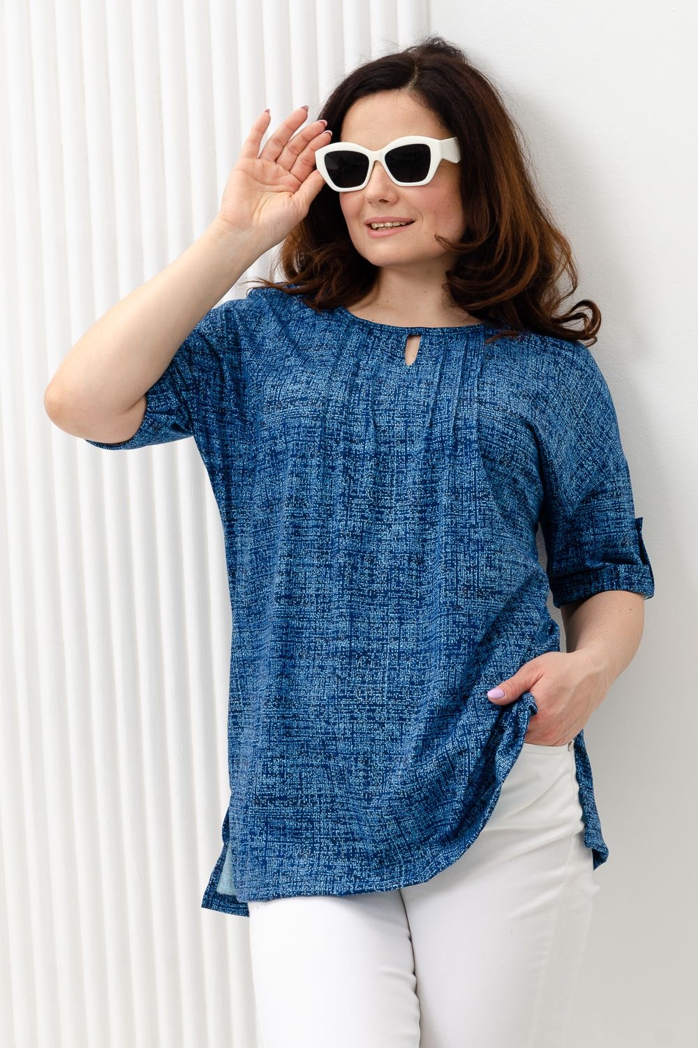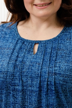 Туника прямая, свободная, с округлой горловиной, с удлиненной спинкой. Рукав короткий, с манжетом и хлястом с пуговицей. В верхней части полочки обработаны декоративные защипы. Спинка с кокеткой. В нижней части боковых швов расположены разрезы. Горловина обработана бейкой из основного полотна.