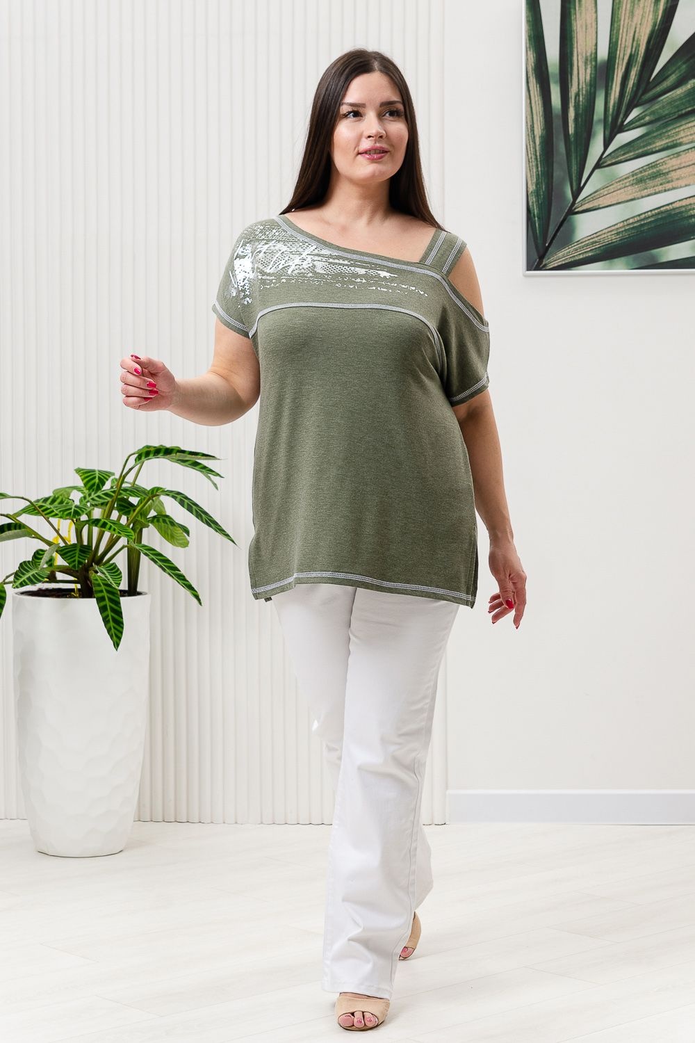 Туника женская полуприлегающего силуэта. Рукав цельнокроенный короткий, с одной стороны бретель на плече, в боковых швах разрезы. В верхней части полочки модный принт.