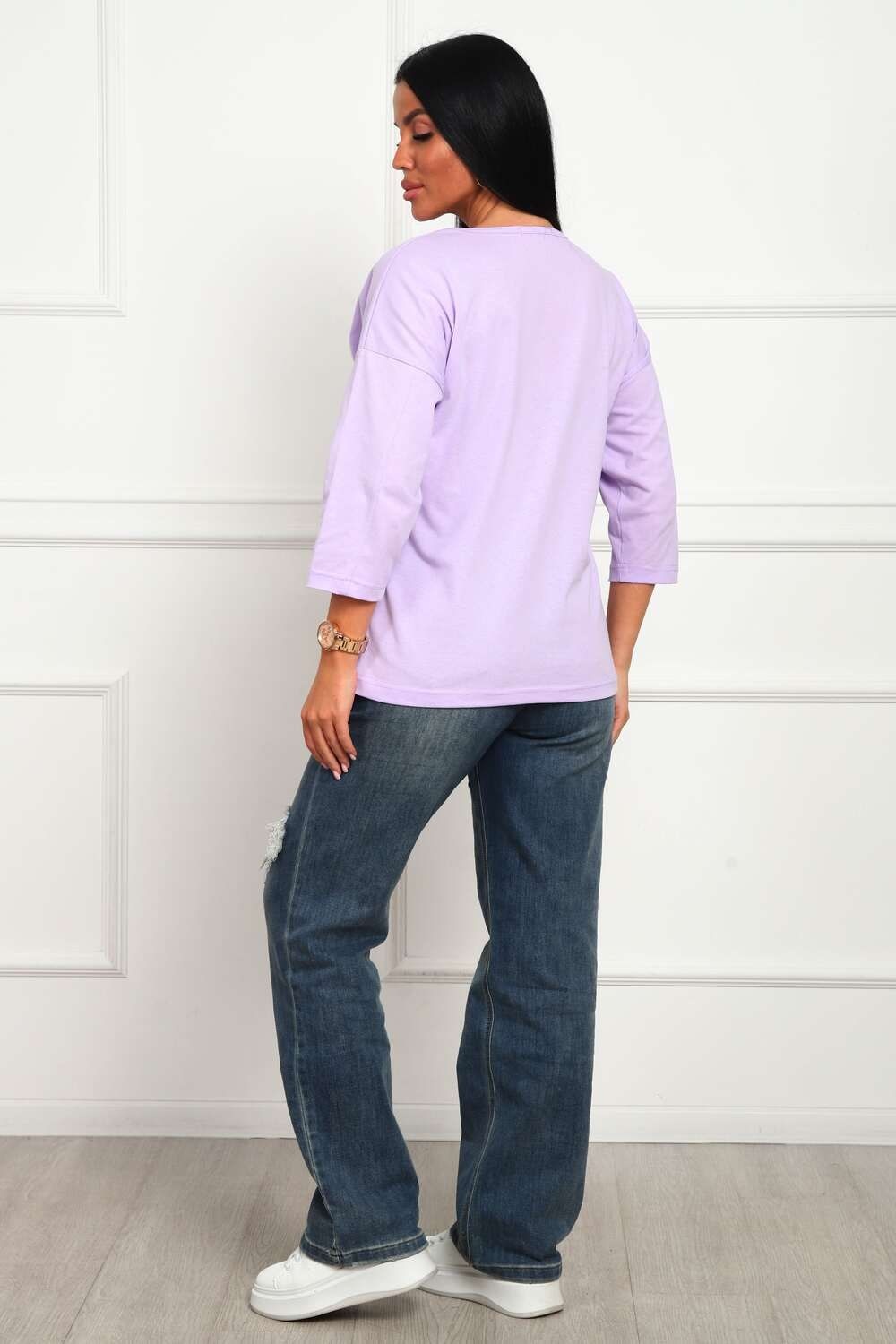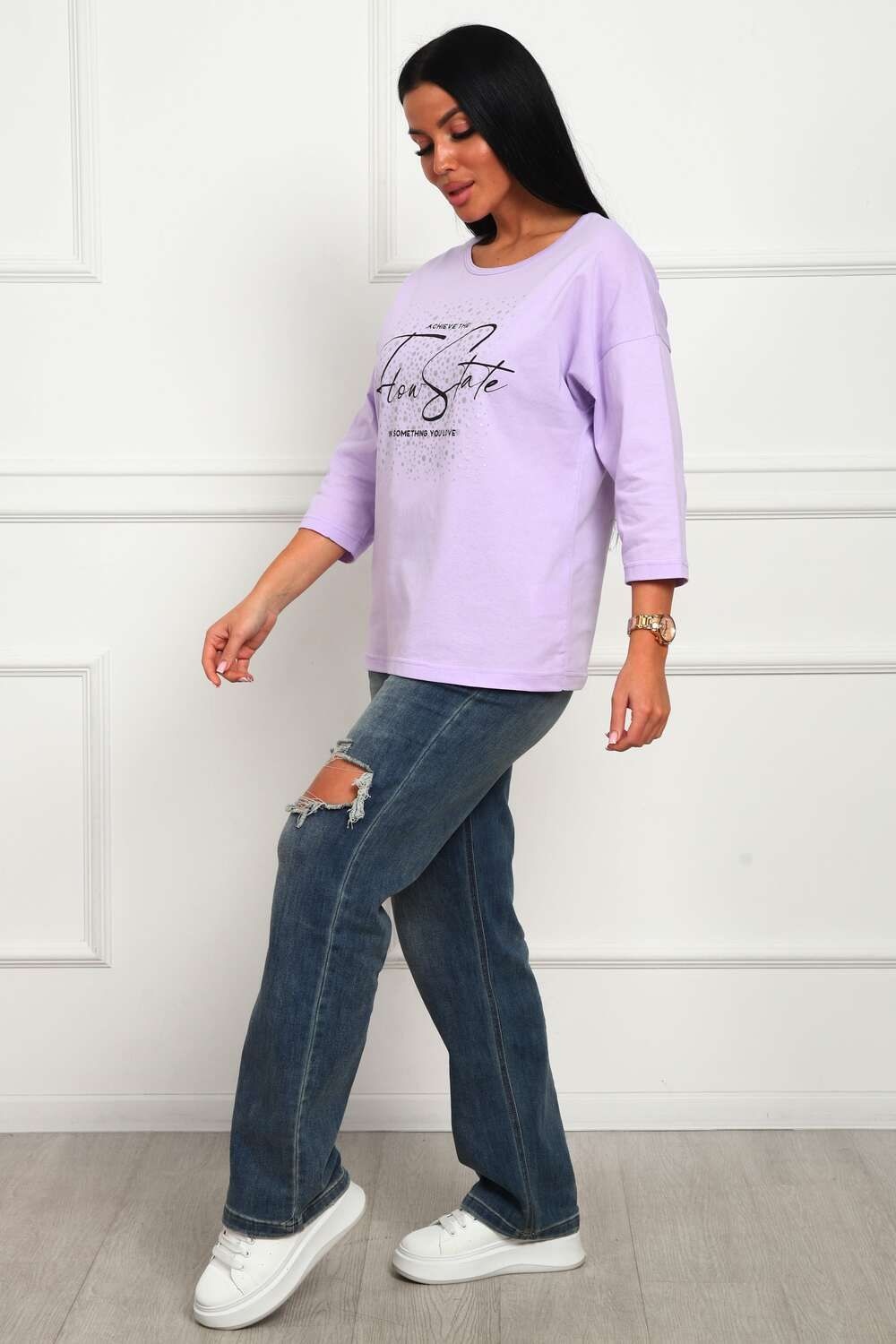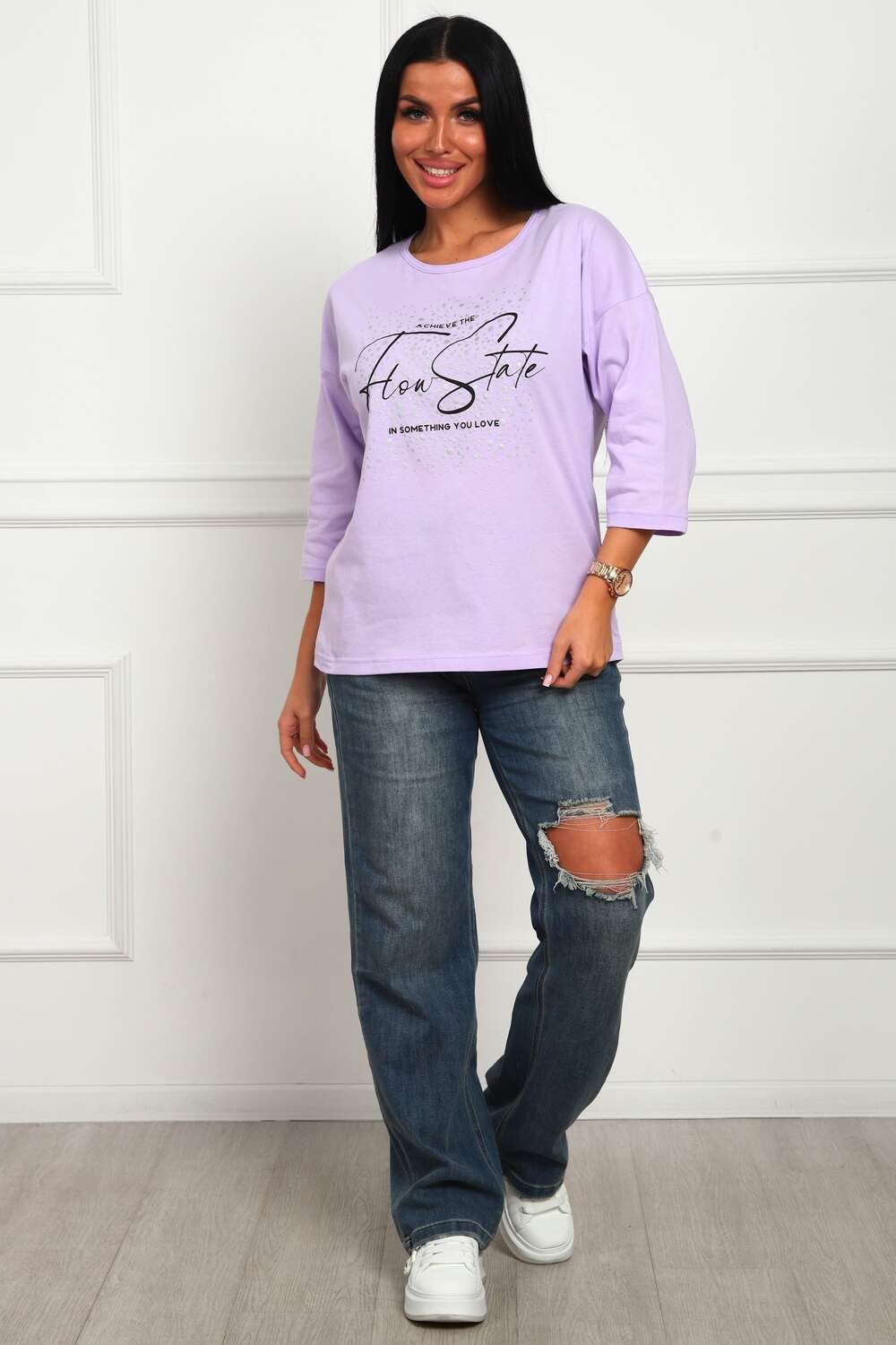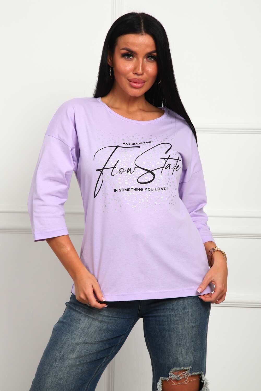 Туника женская. Ткань кулирка, хлопок 100%. Крой свободный. горловина круглой формы, обработана окантовкой. Линия плеч спущена. Длинна рукава 3/4, со швом по локтю. Низ изделия прямой. На полочке принт, шелкография.