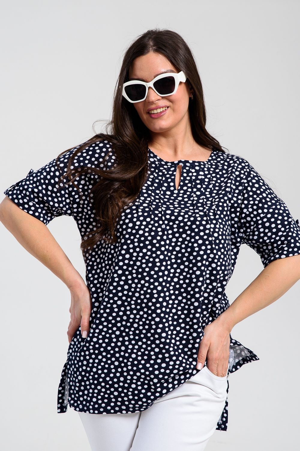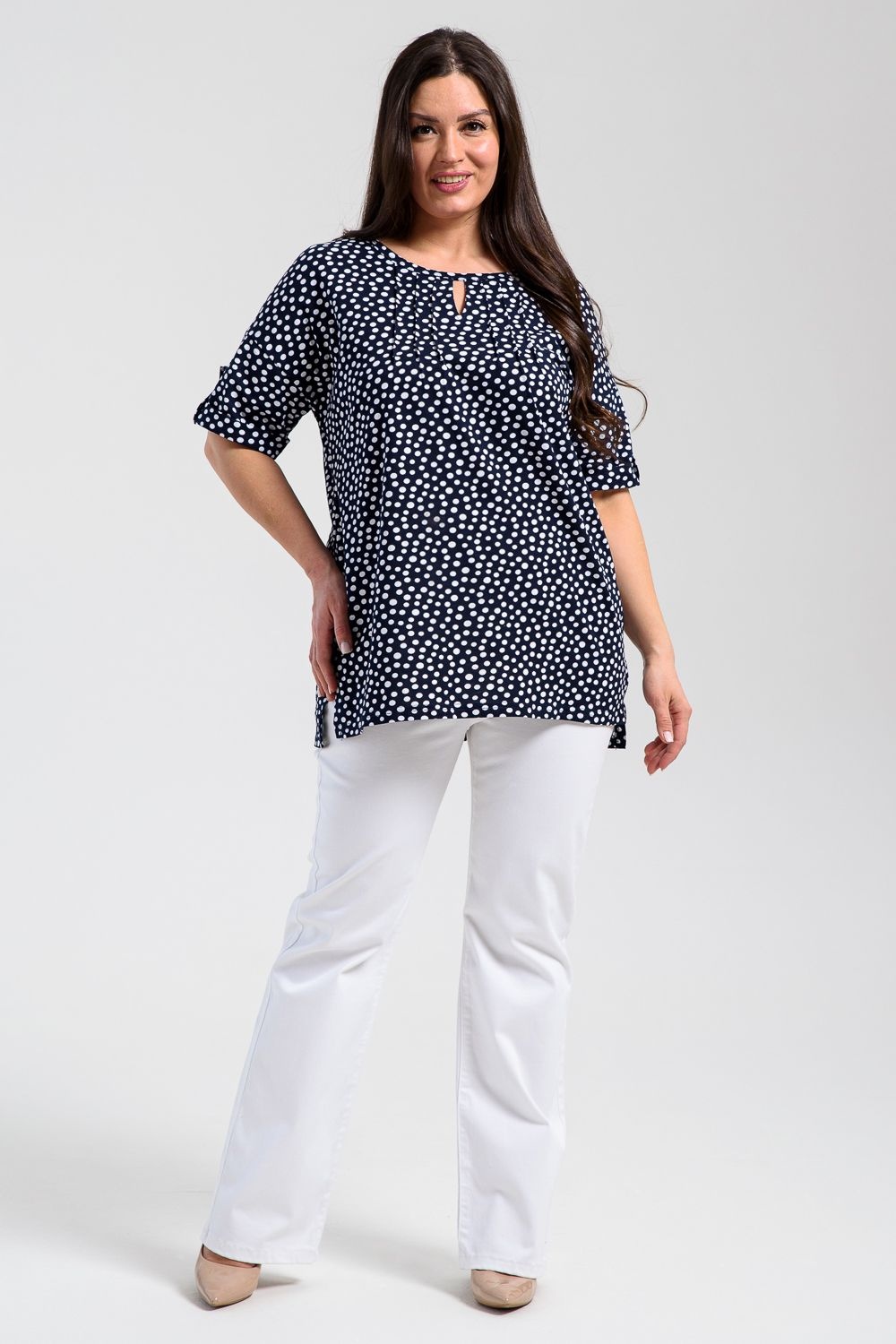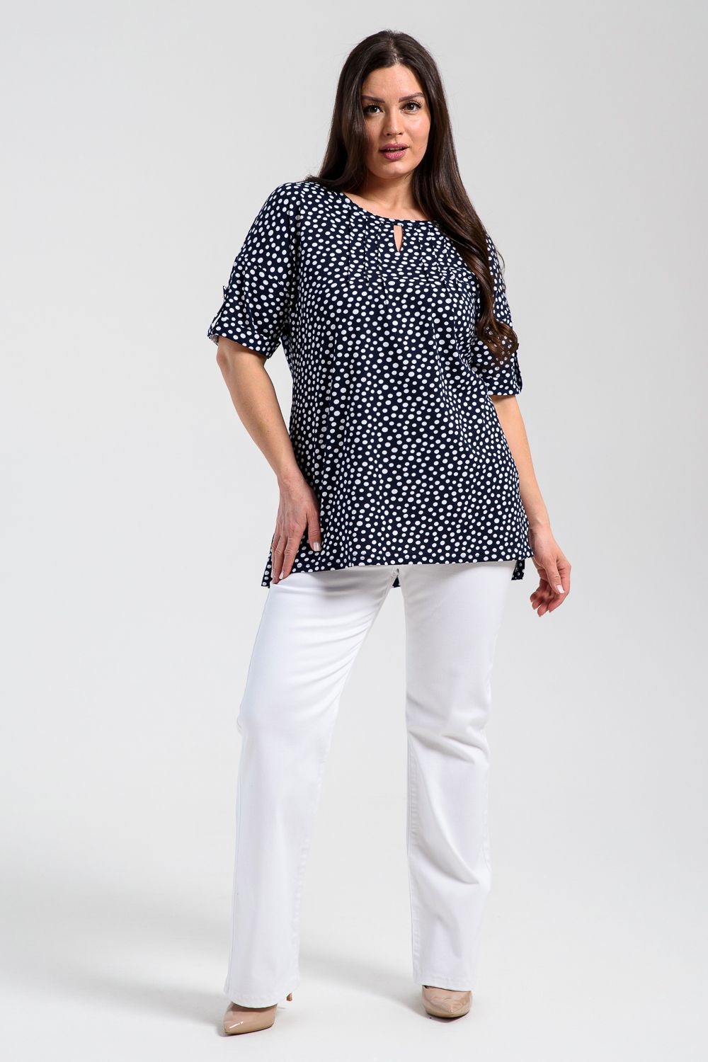 Туника прямая, свободная, с округлой горловиной, с удлиненной спинкой. Рукав короткий, с манжетом и хлястом с пуговицей. В верхней части полочки обработаны декоративные защипы. Спинка с кокеткой. В нижней части боковых швов расположены разрезы. Горловина обработана бейкой из основного полотна.