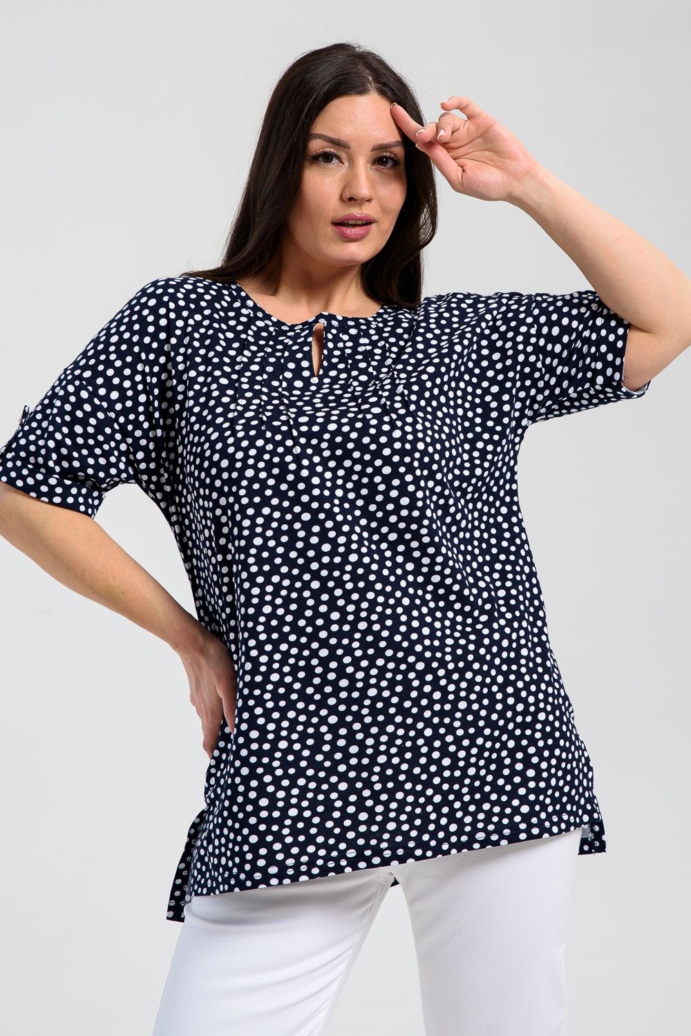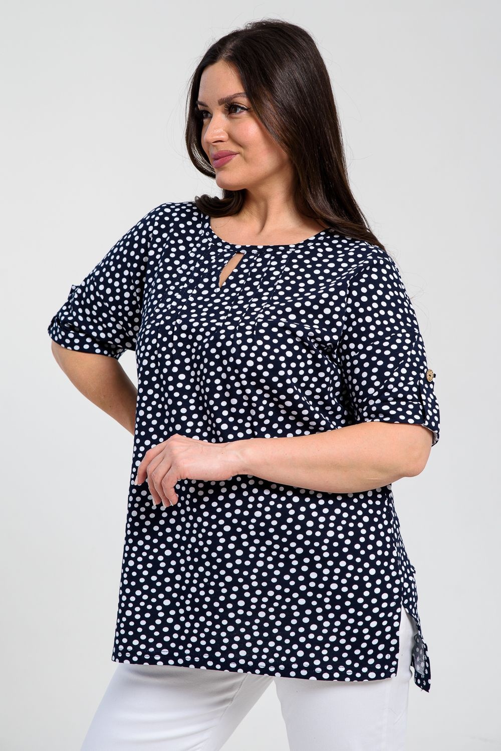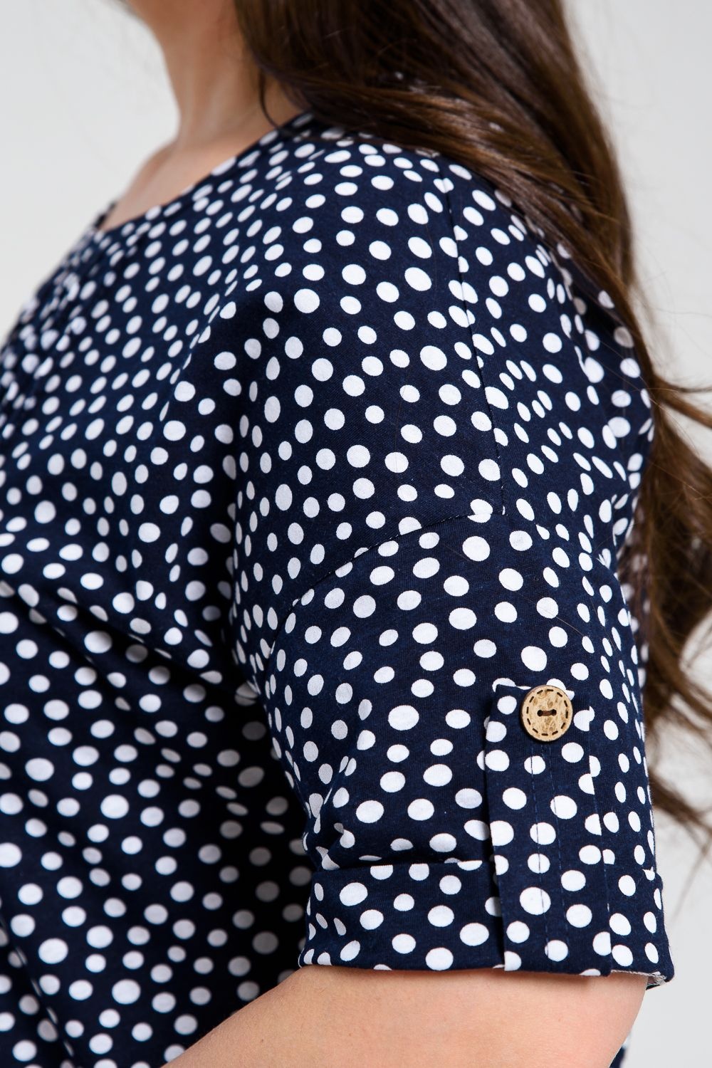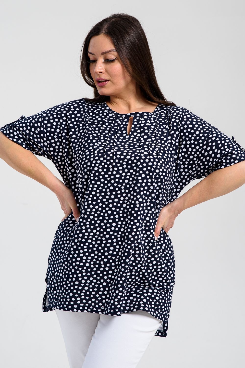 Туника прямая, свободная, с округлой горловиной, с удлиненной спинкой. Рукав короткий, с манжетом и хлястом с пуговицей. В верхней части полочки обработаны декоративные защипы. Спинка с кокеткой. В нижней части боковых швов расположены разрезы. Горловина обработана бейкой из основного полотна.