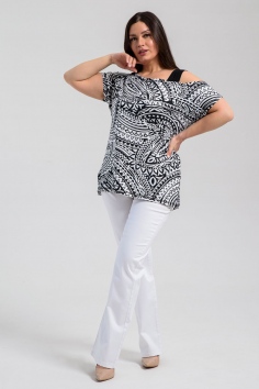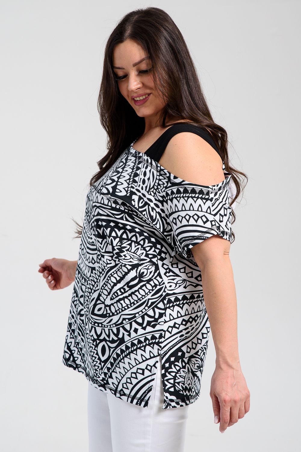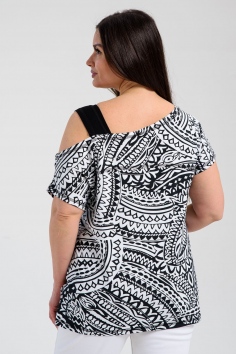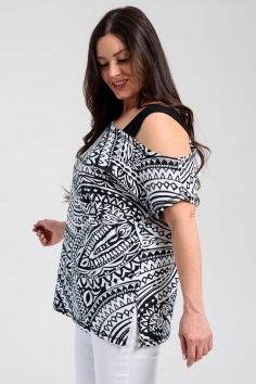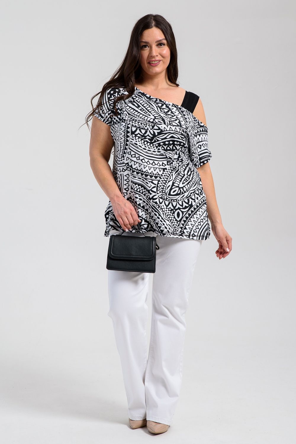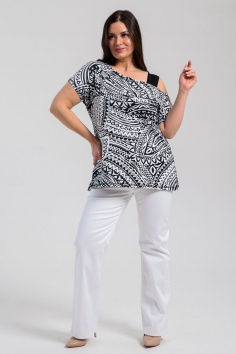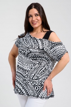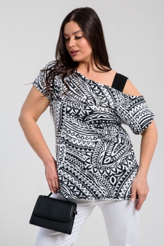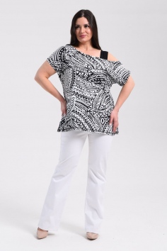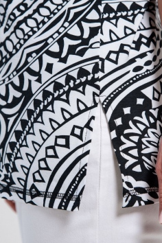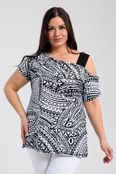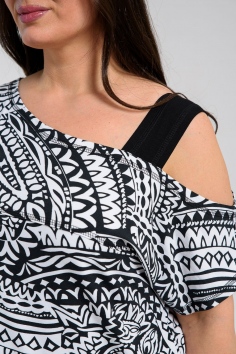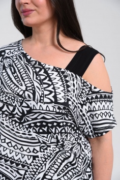 Туника женская полуприлегающего силуэта. Рукав цельнокроенный короткий, с одной стороны бретель на плече, в боковых швах разрезы. В верхней части полочки модный принт.