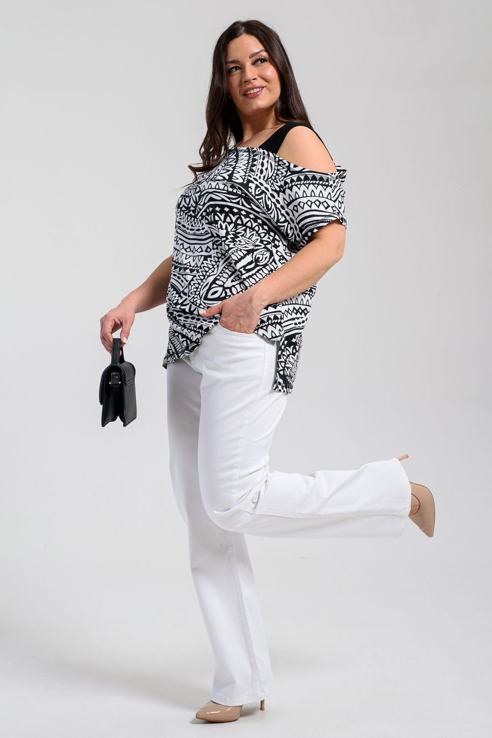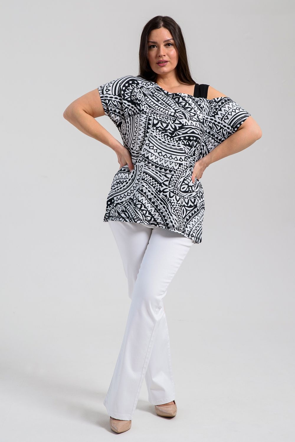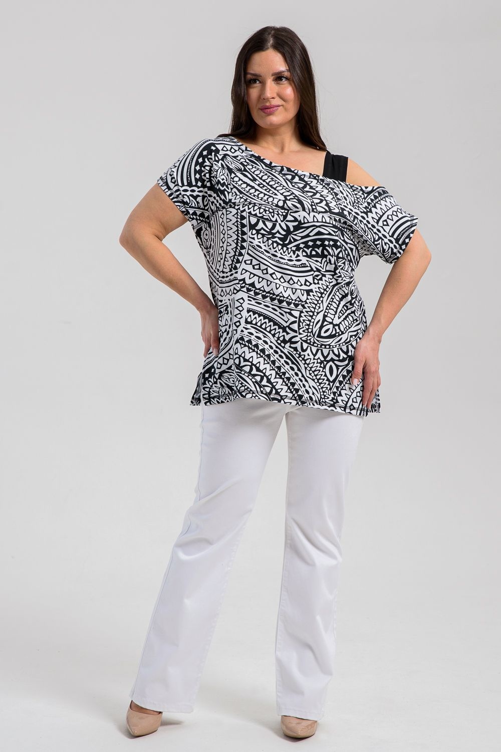 Туника женская полуприлегающего силуэта. Рукав цельнокроенный короткий, с одной стороны бретель на плече, в боковых швах разрезы. В верхней части полочки модный принт.