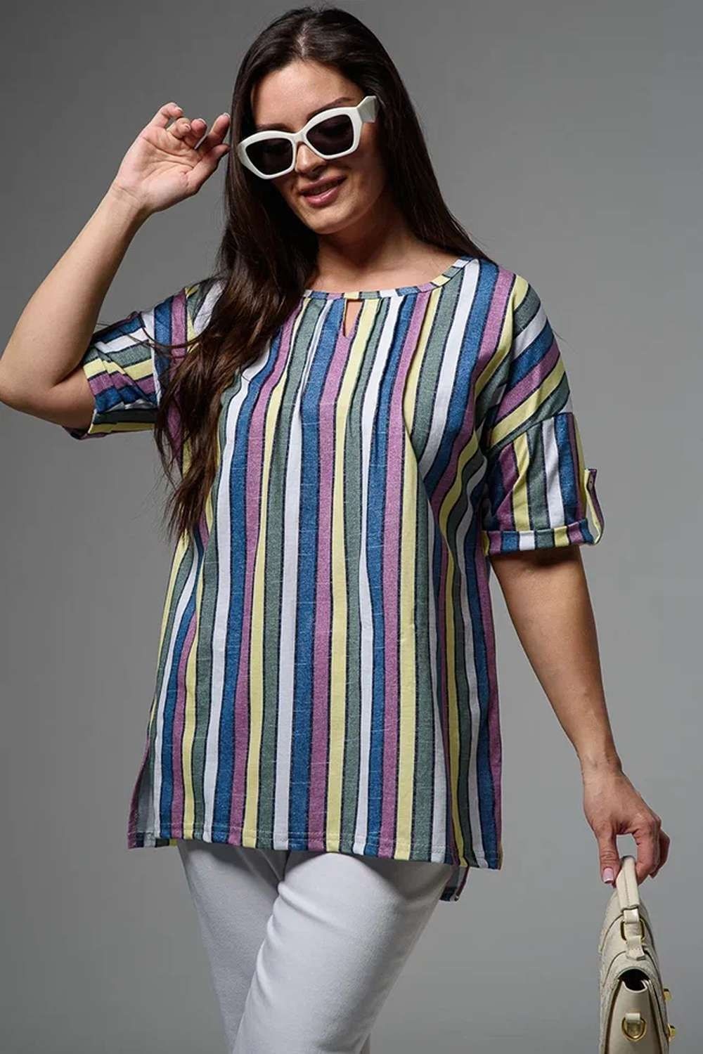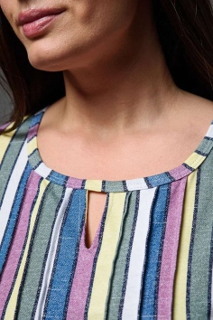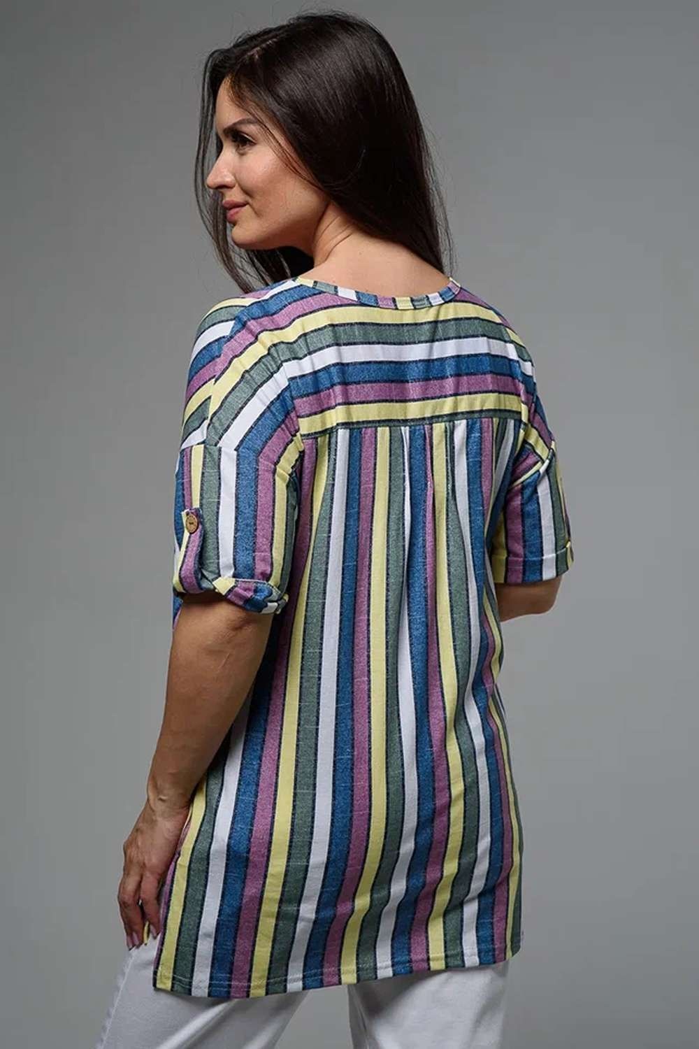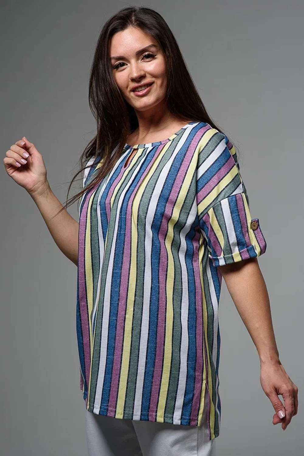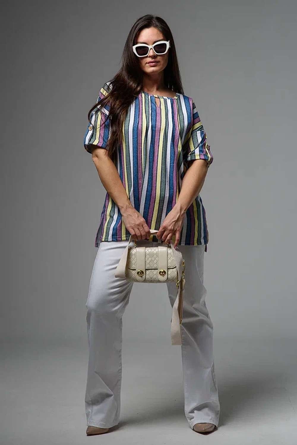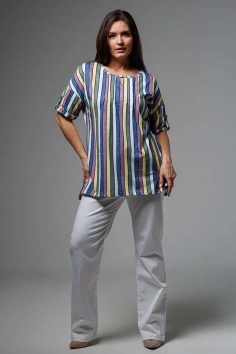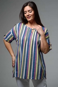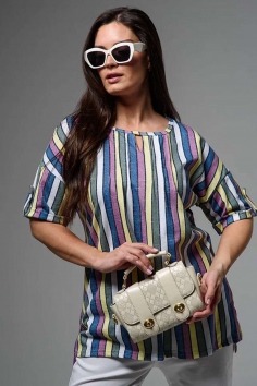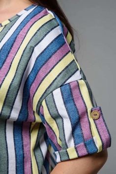 Туника прямая, свободная, с округлой горловиной, с удлиненной спинкой. Рукав короткий, с манжетом и хлястом с пуговицей. В верхней части полочки обработаны декоративные защипы. Спинка с кокеткой. В нижней части боковых швов расположены разрезы. Горловина обработана бейкой из основного полотна.