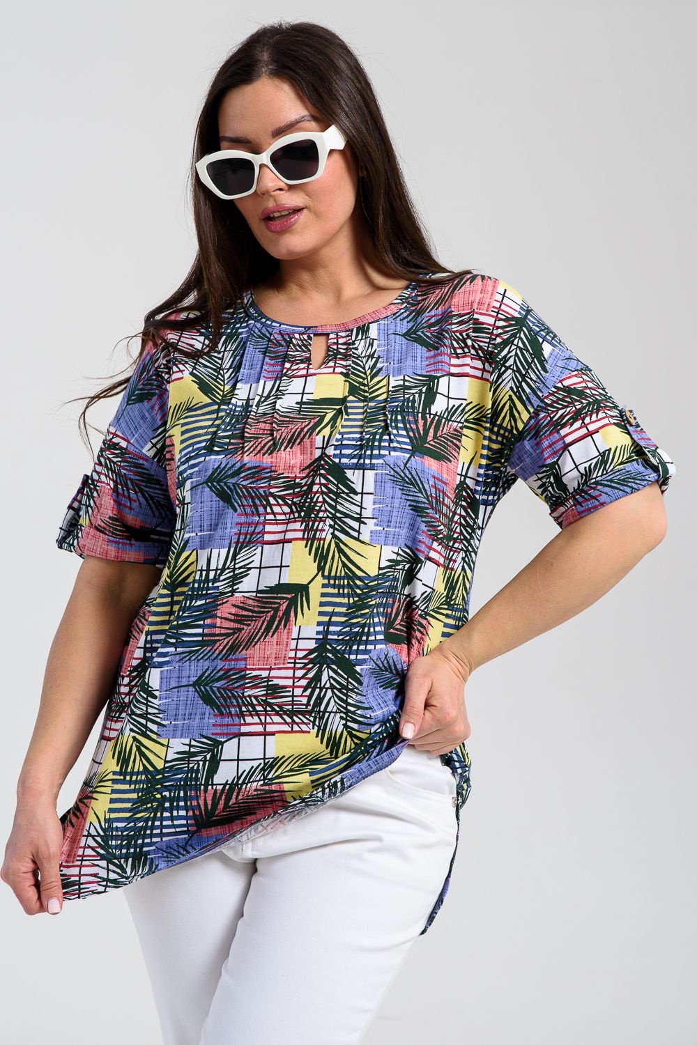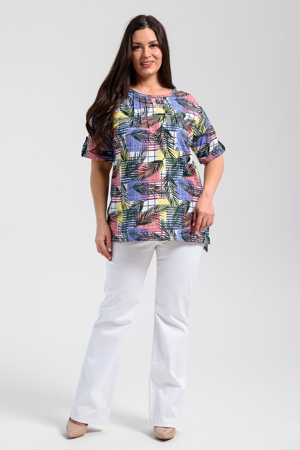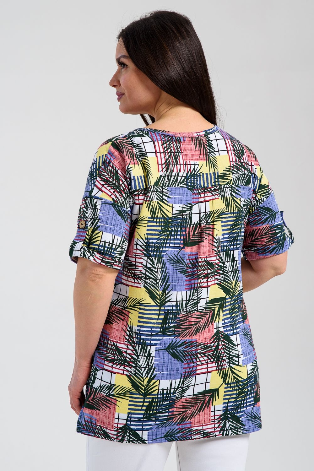 Туника прямая, свободная, с округлой горловиной, с удлиненной спинкой. Рукав короткий, с манжетом и хлястом с пуговицей. В верхней части полочки обработаны декоративные защипы. Спинка с кокеткой. В нижней части боковых швов расположены разрезы. Горловина обработана бейкой из основного полотна.