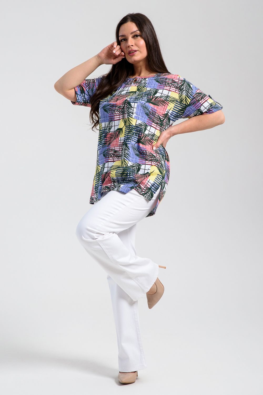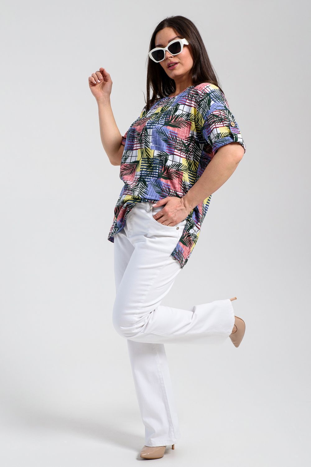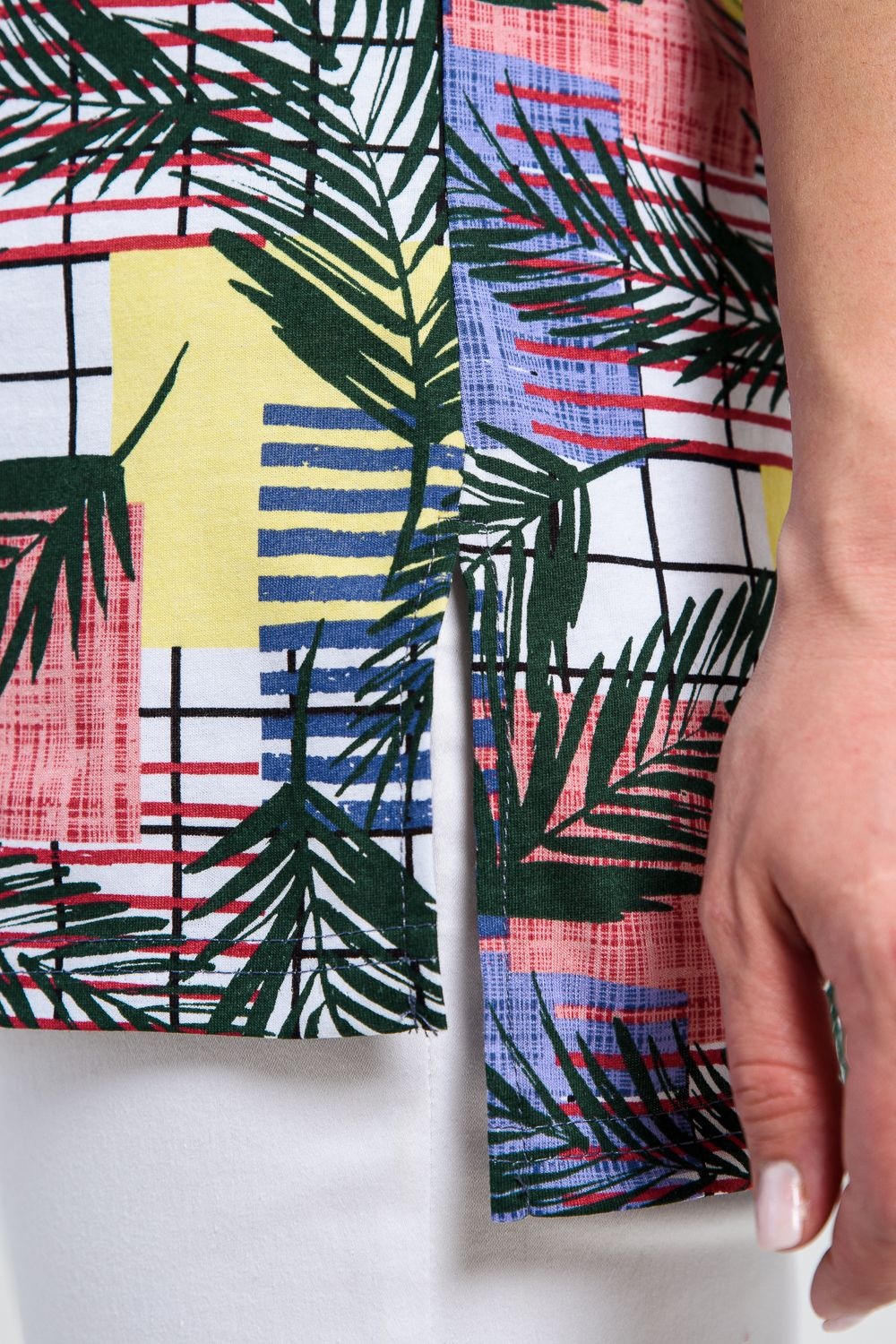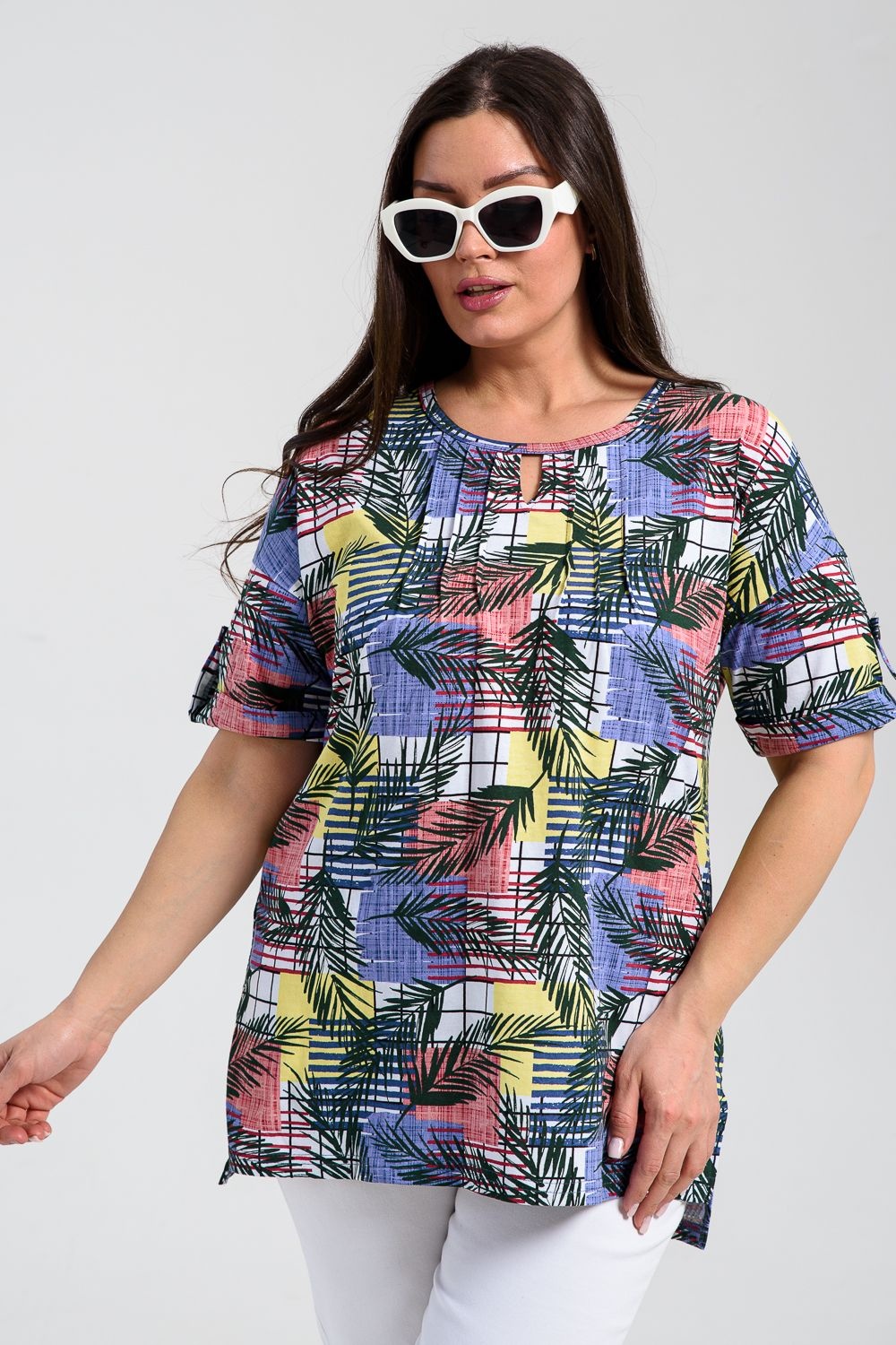 Туника прямая, свободная, с округлой горловиной, с удлиненной спинкой. Рукав короткий, с манжетом и хлястом с пуговицей. В верхней части полочки обработаны декоративные защипы. Спинка с кокеткой. В нижней части боковых швов расположены разрезы. Горловина обработана бейкой из основного полотна.