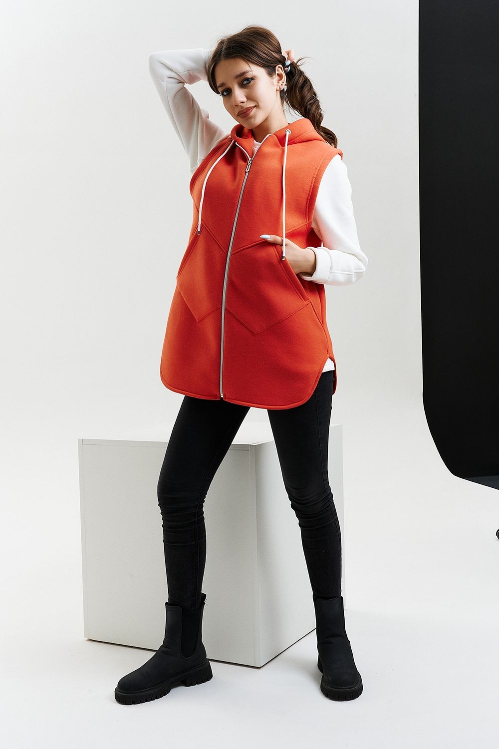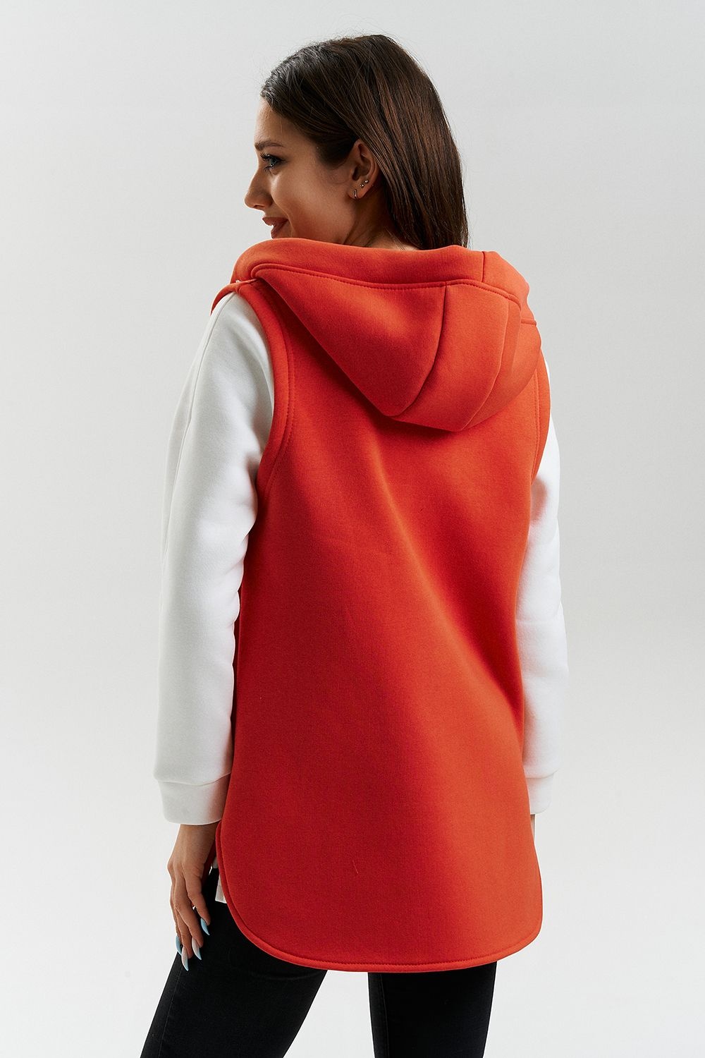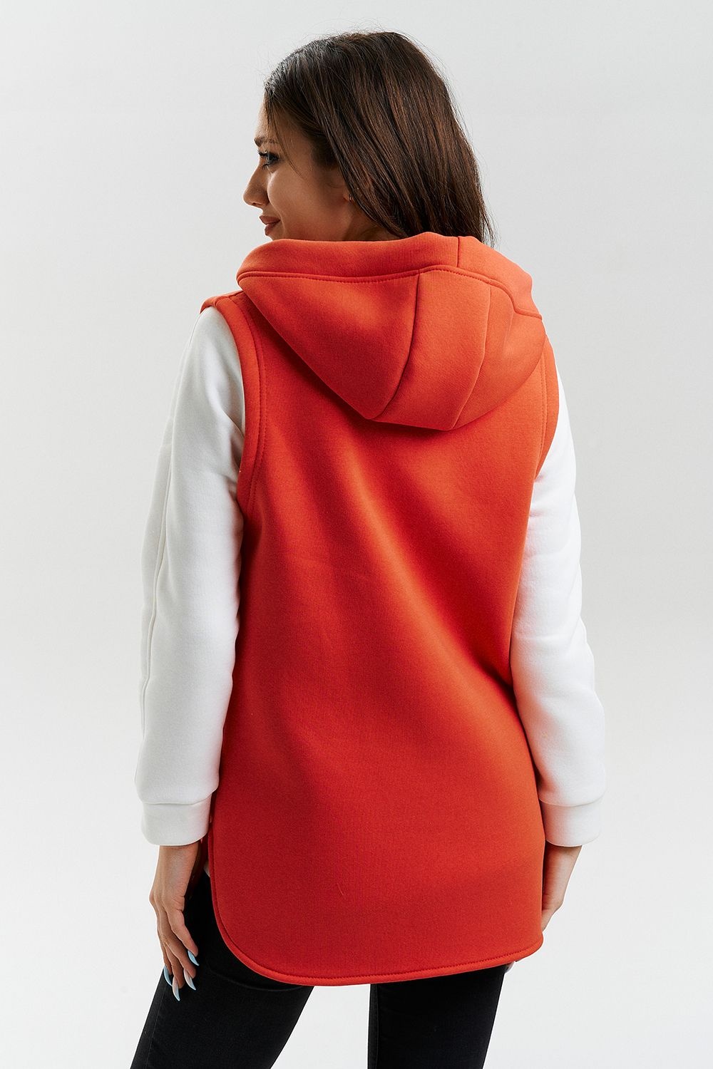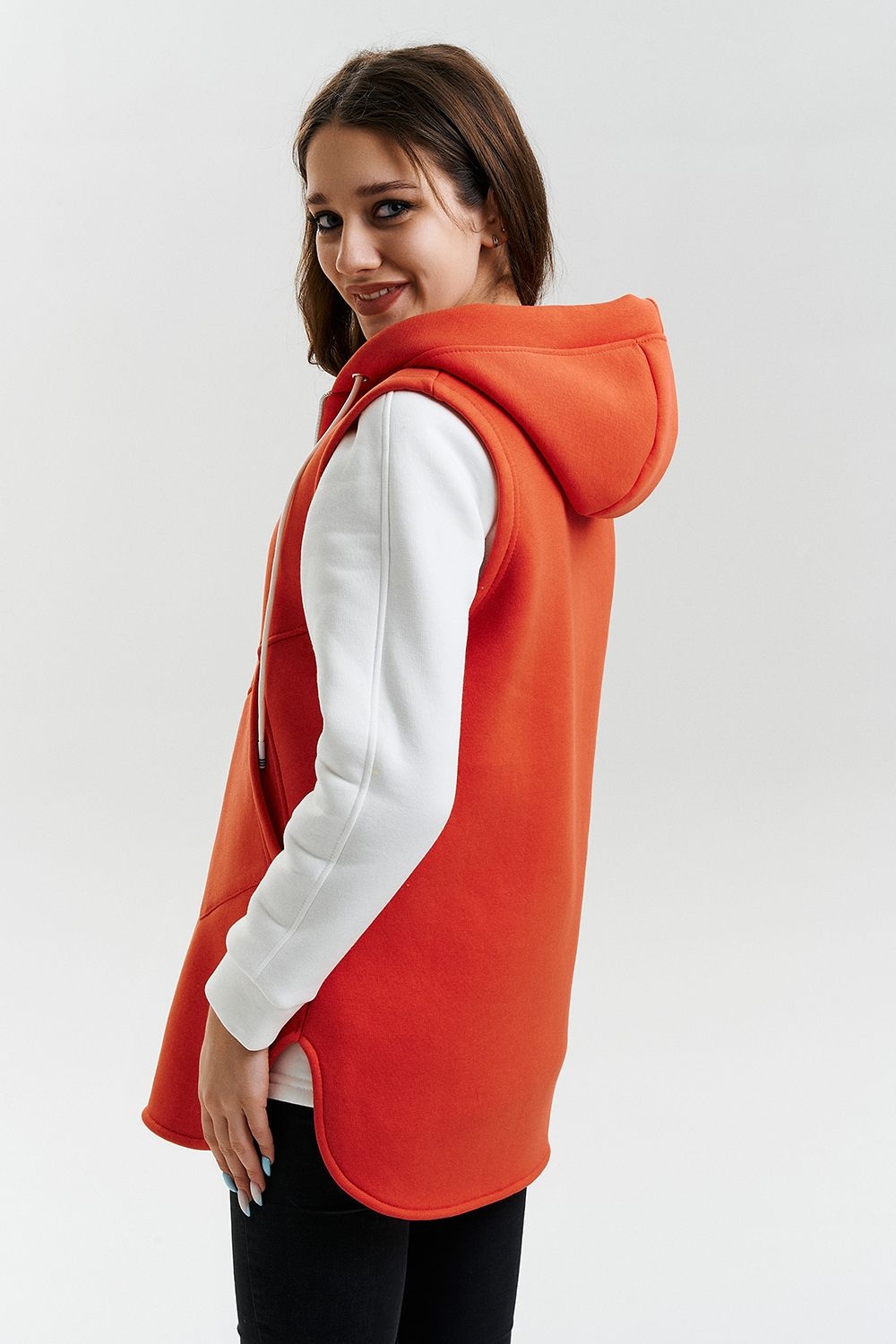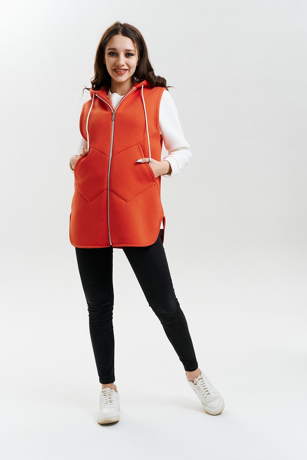 Жилет утепленный, прямой, на молнии, с капюшоном, с фигурной линией низа. Полочка с фигурными кокетками и удобными накладными карманами.