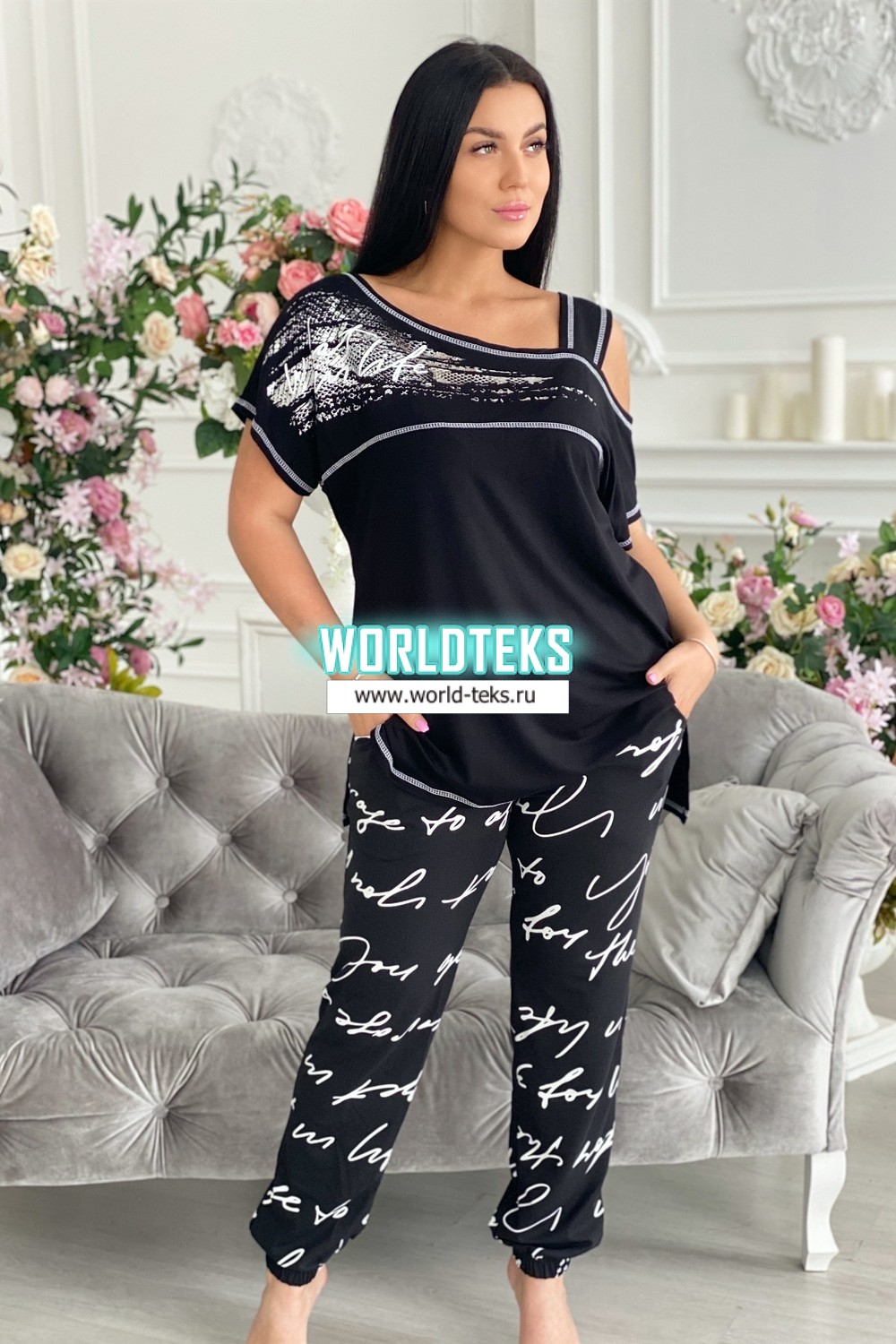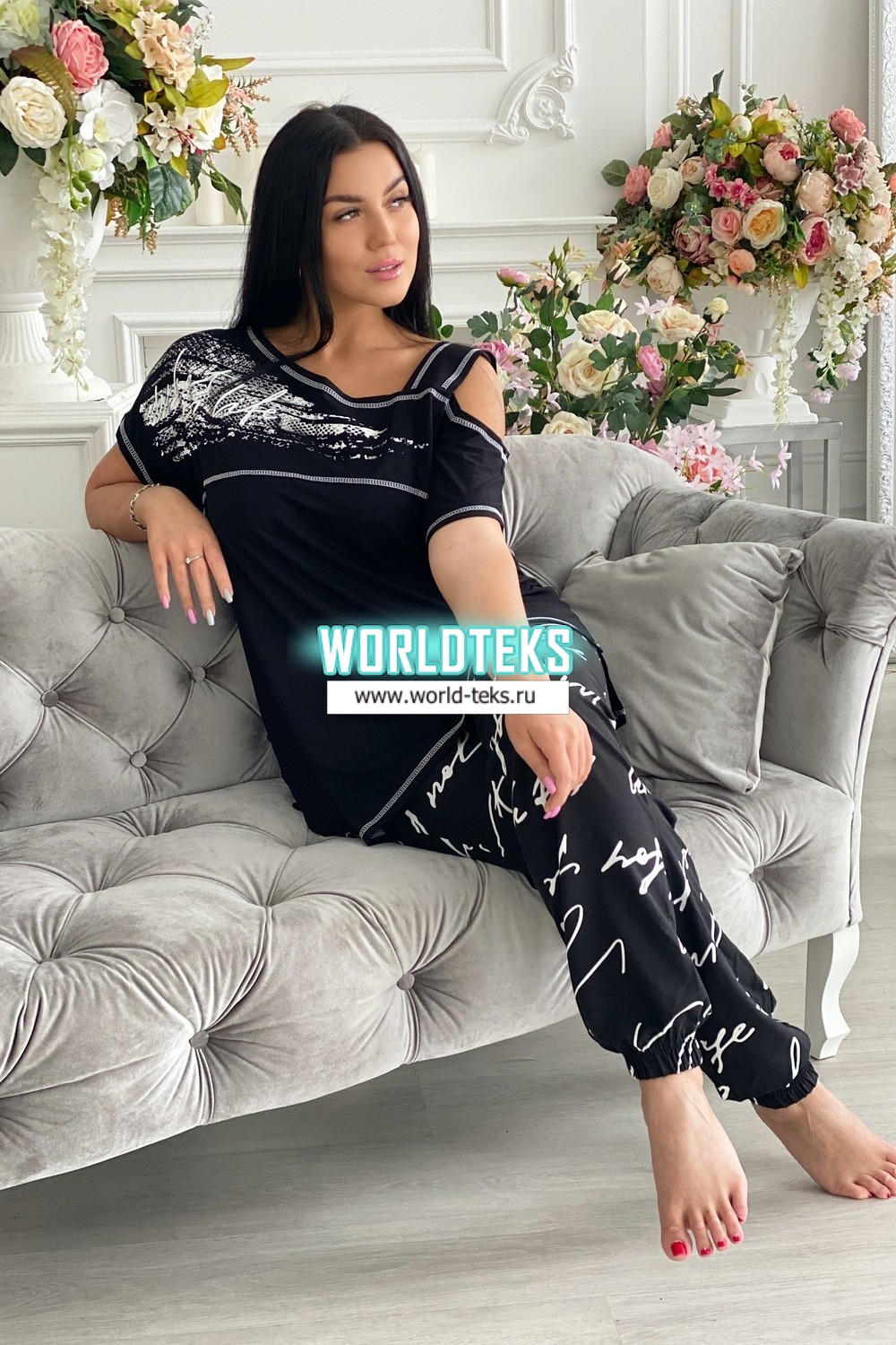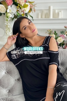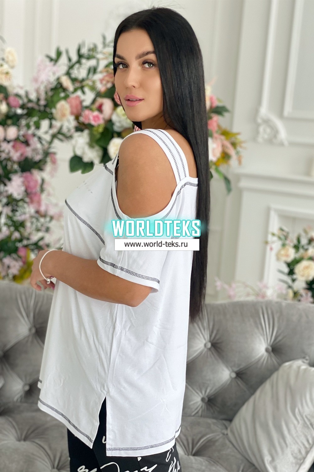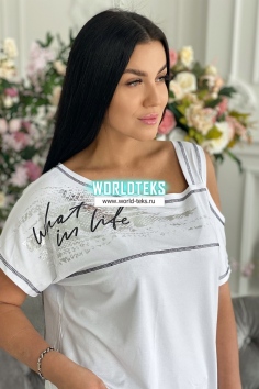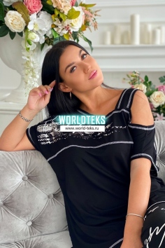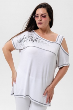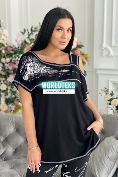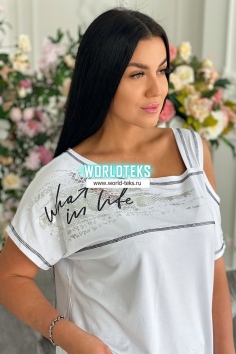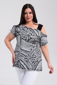 Туника женская полуприлегающего силуэта. Рукав цельнокроенный короткий, с одной стороны бретель на плече, в боковых швах разрезы. В верхней части полочки модный принт.