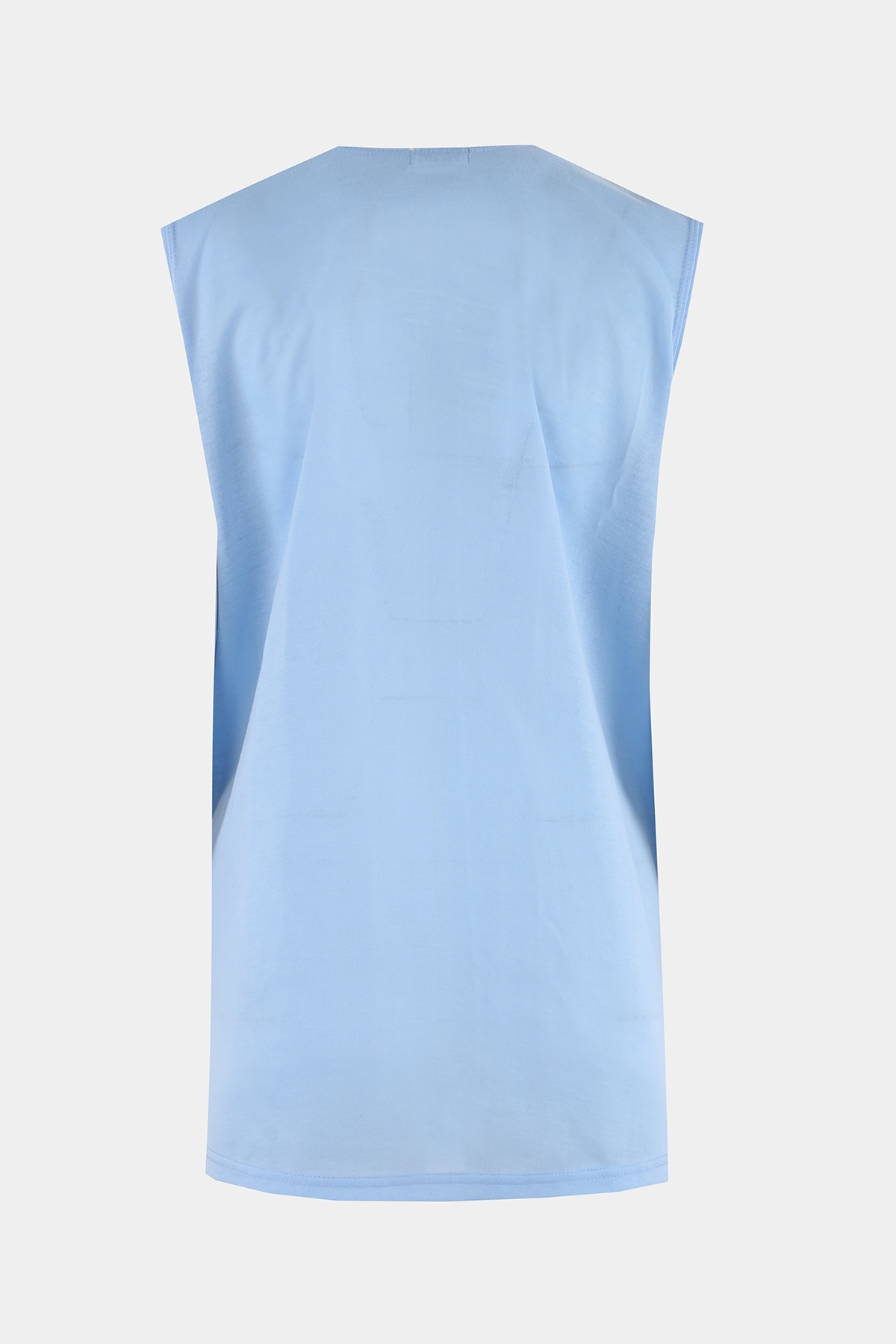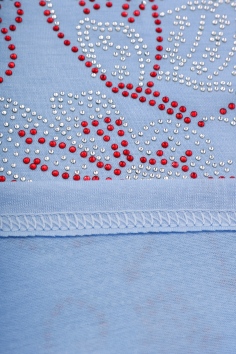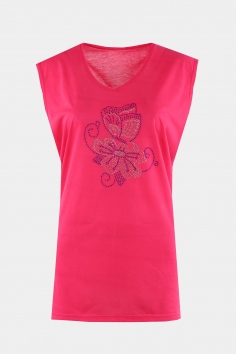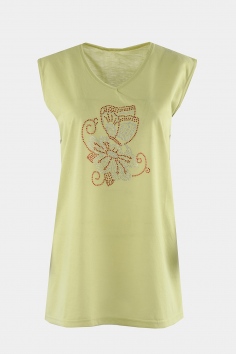 Майка идеально подходит для тёплого времени года. Майка женская прямого кроя с V образным вырезом горловины. Спереди майка украшена стразами. Ткань приятная к телу и хорошо тянется.
