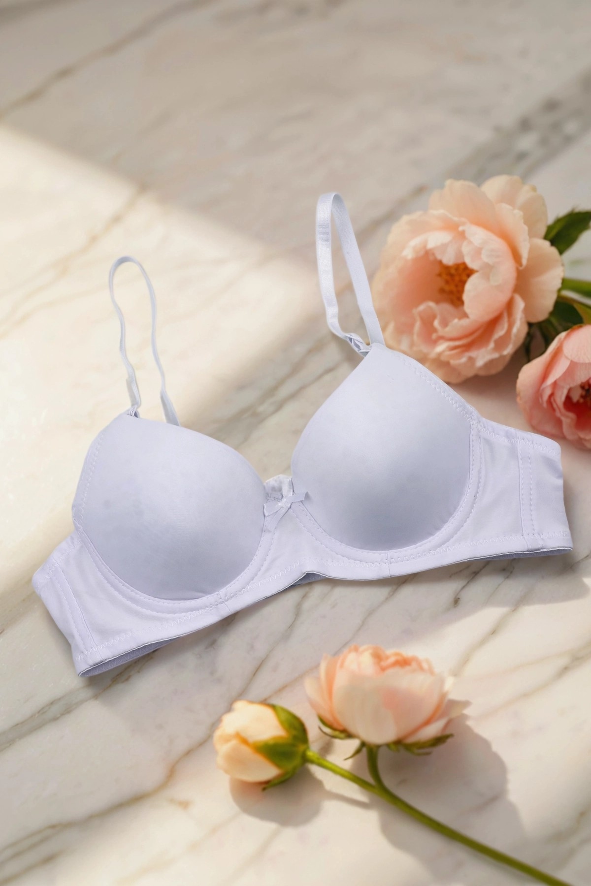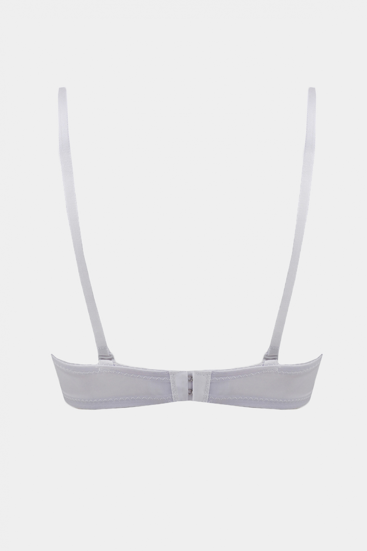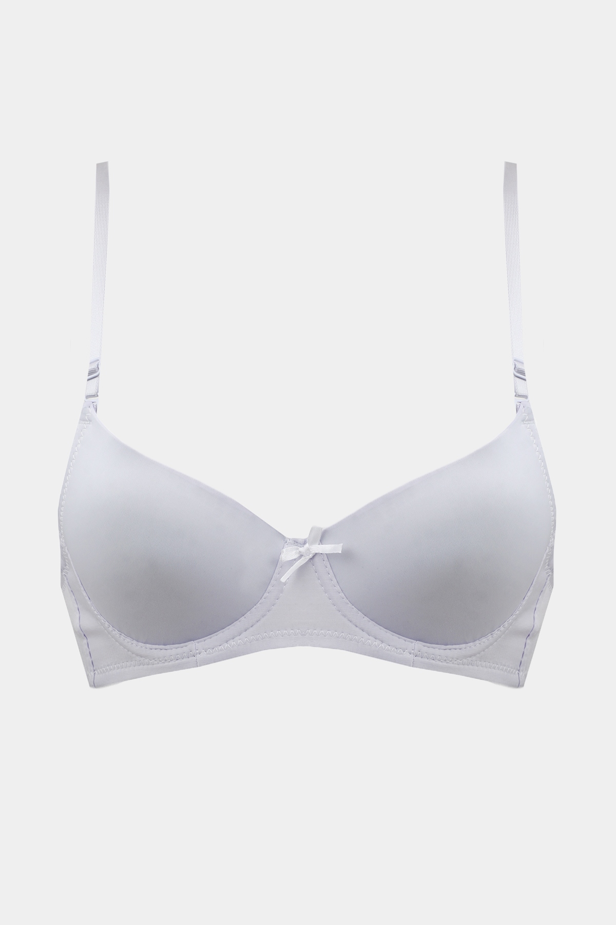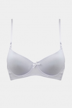 Женский бюстгальтер с чашками и косточками. Застежка на крючки и петли сзади. Съемные бретели регулируются по длине. Бюстгальтер украшен бантиком посередине.
