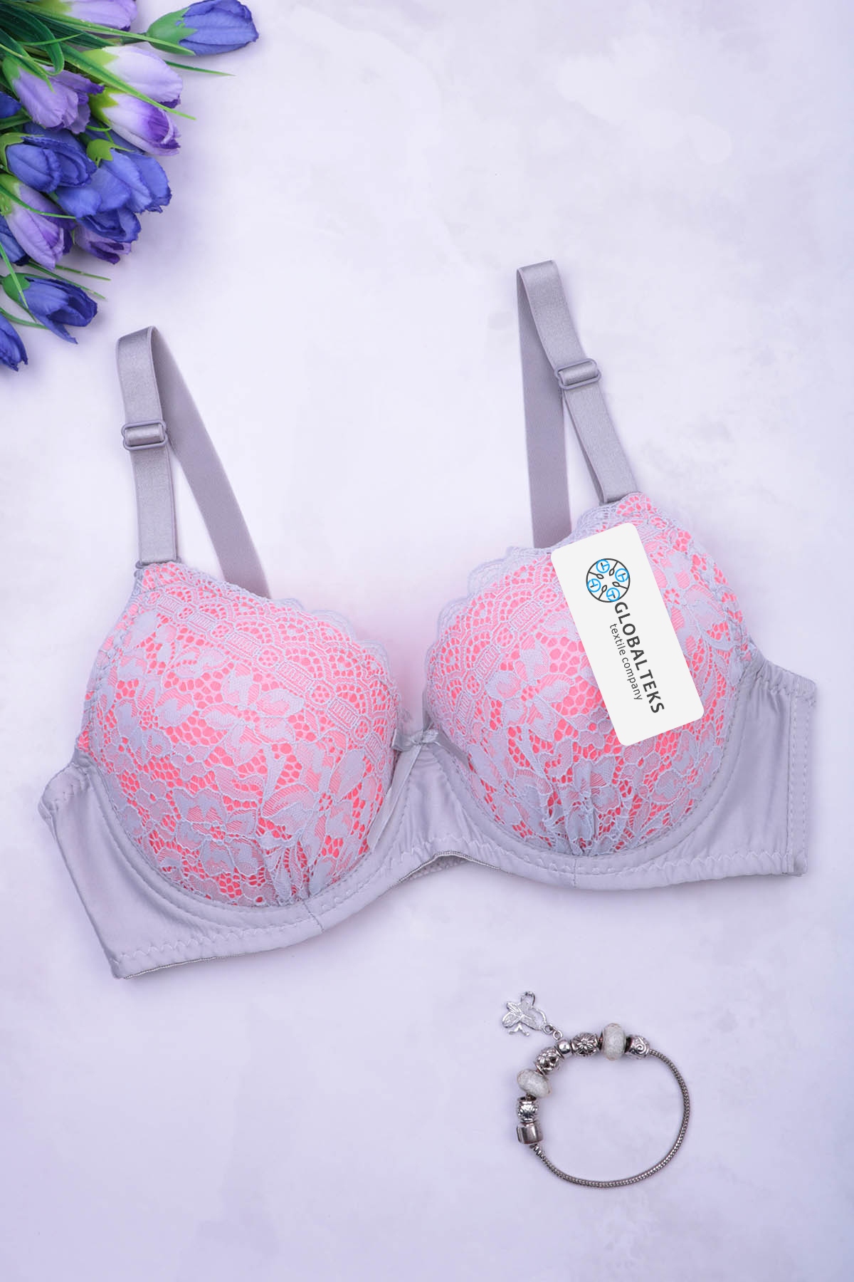 Женский бюстгальтер с чашками и косточками. Застежка на крючки и петли сзади. Съемные бретели регулируются по длине. Бюстгальтер украшен кружевом и бантиком посередине.