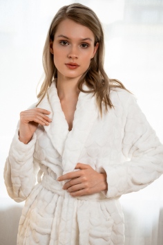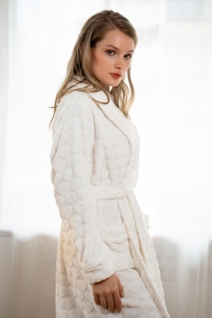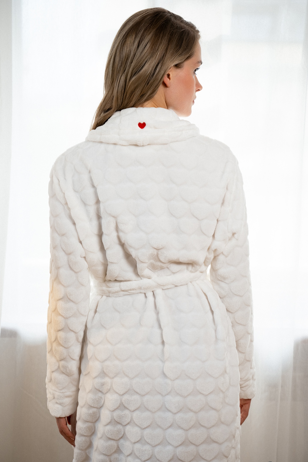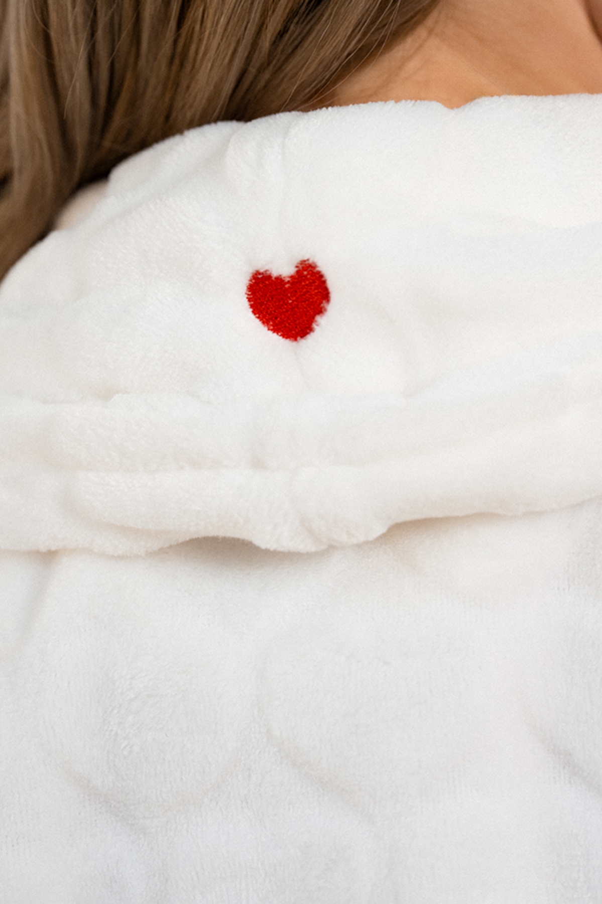 Мягкий белый халат выполнен из приятного на ощупь и легкого материала. Модель украшена объемным узором в виде сердечек и дополнена поясом на талии для идеальной посадки. Удобные карманы обеспечивают максимальный комфорт в повседневном использовании. Минималистичный дизайн дополняет маленькое красное сердечко на воротнике, придавая изделию особый шарм. Идеальный выбор для домашнего уюта и расслабленного отдыха.